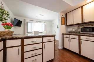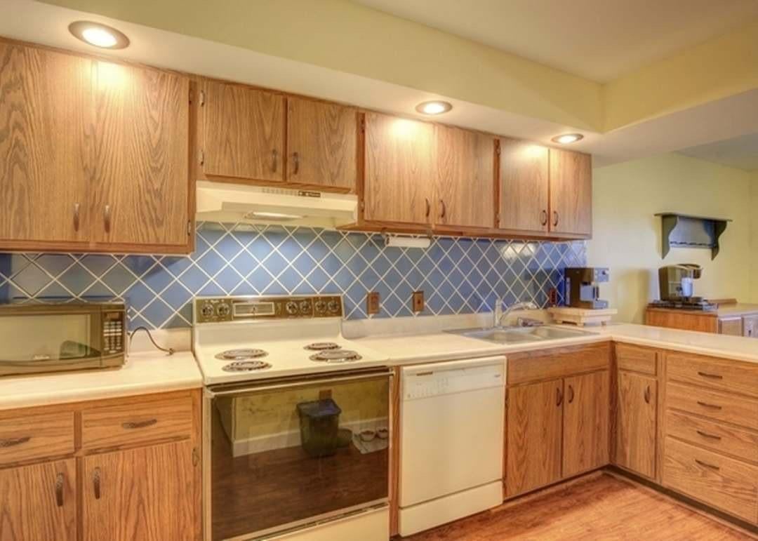 Looking for ideas to remodel our kitchen. Previous owner use vinyl wrapping over the countertop and stick on tiles as well as wallpaper for the cabinets. There is a blue tile under the sticker. We are thinking of replacing the countertop and would love some painting schemes or any ideas to improve this space! Would anything work with the blue tile? Thanks!