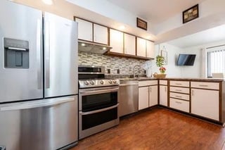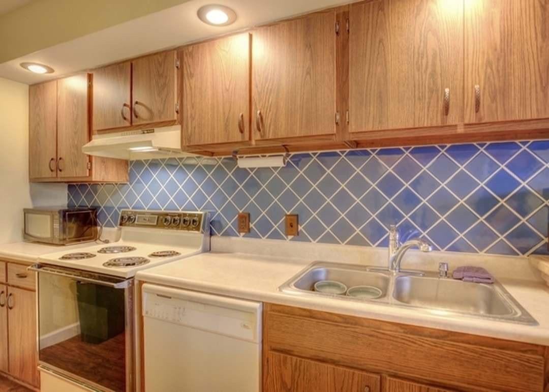 Looking for ideas to remodel our kitchen. Previous owner use vinyl wrapping over the countertop and stick on tiles as well as wallpaper for the cabinets. There is a blue tile under the sticker. We are thinking of replacing the countertop and would love some painting schemes or any ideas to improve this space! Would anything work with the blue tile? Thanks!