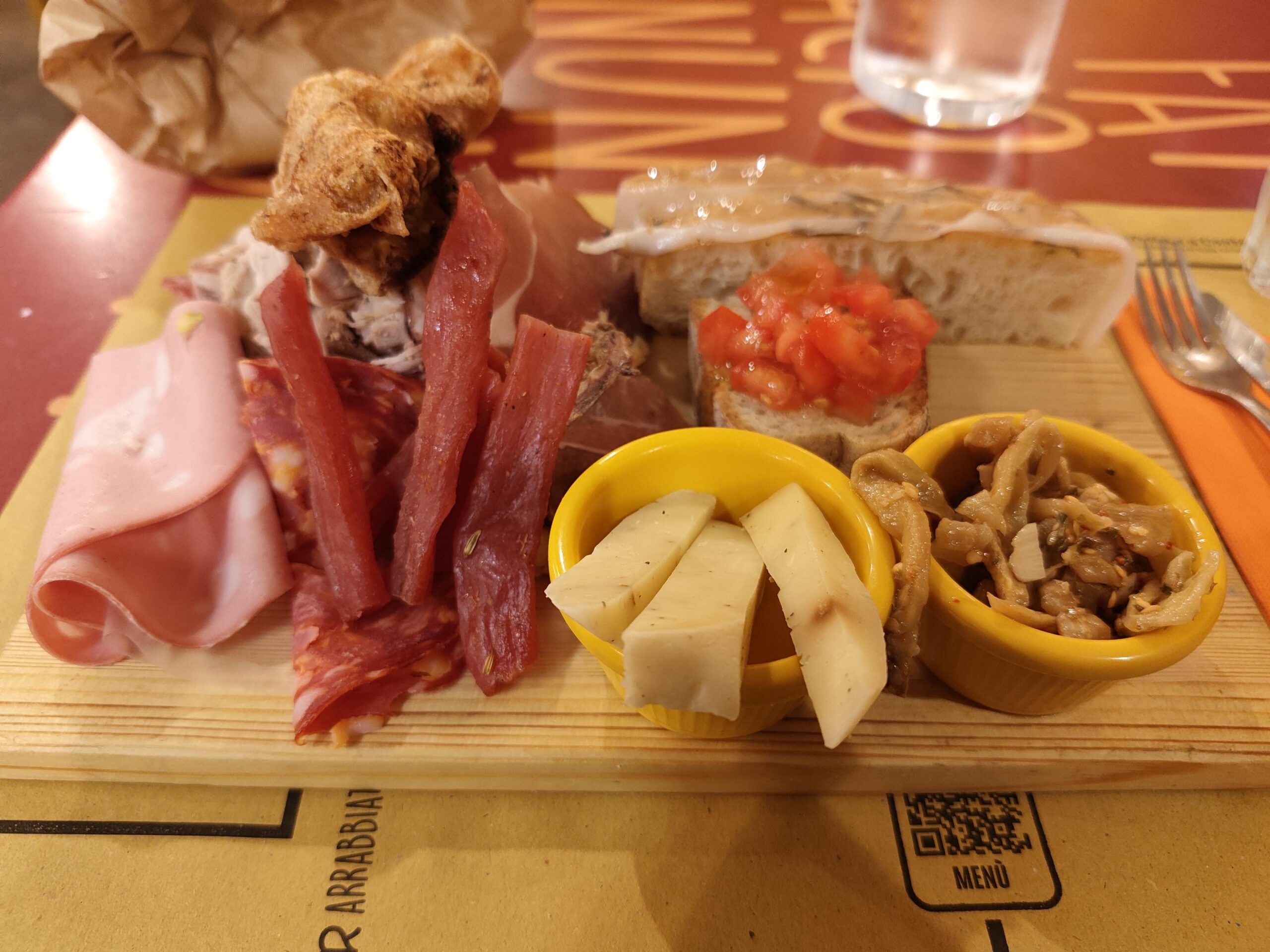 Back row: a huge pile of porchetta with a big piece of crackling, some cured ham, a tomato bruschetta, and in the far back on the right two slices of fried bread wrapped in speck.
