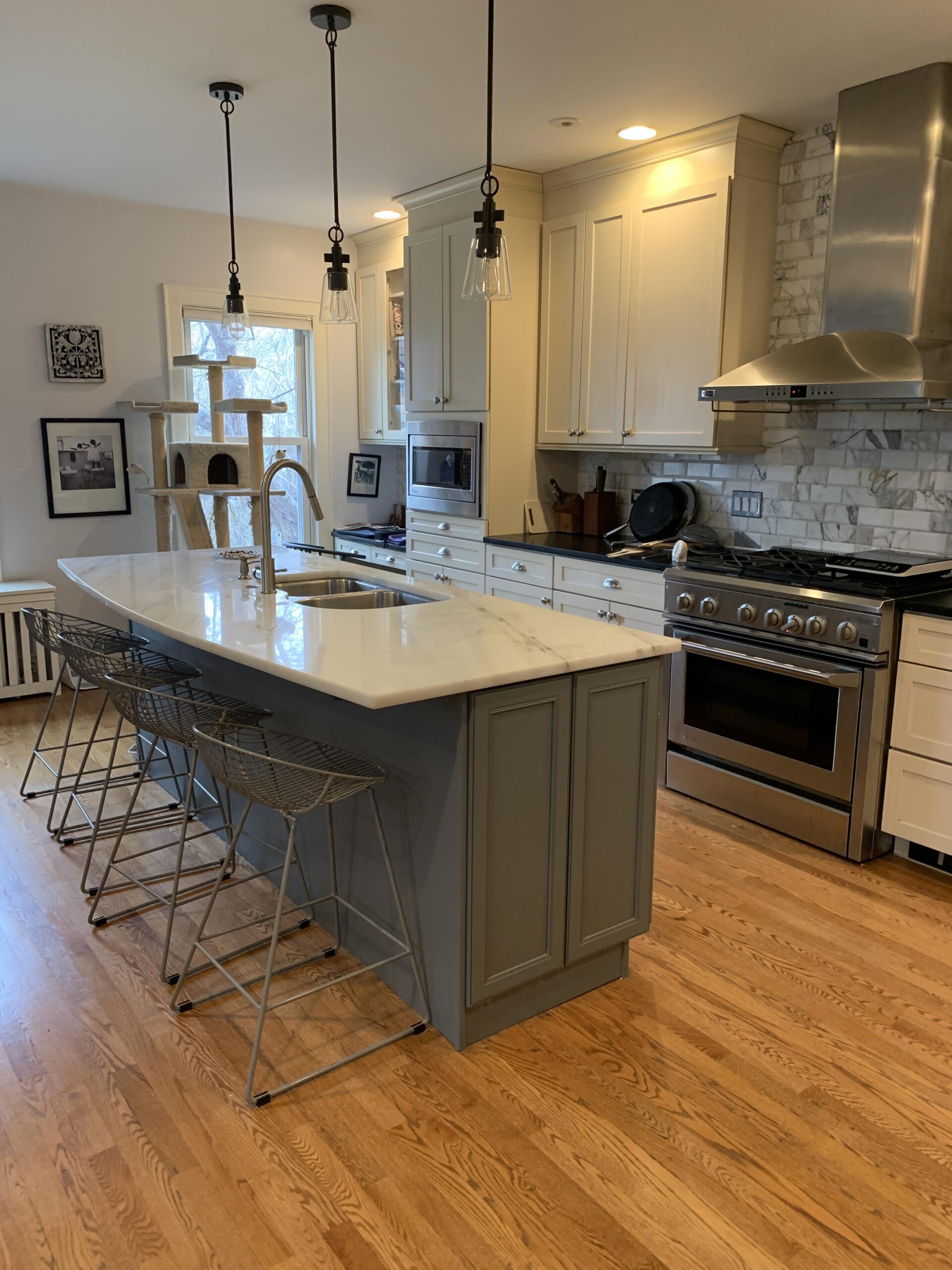 When we bought this house, this kitchen was already done. Pretty much as is. We did replace the hanging lights because one of them was broken and we painted the island gray because it was very beat up wood. The top of the island is actual marble, which is an extremely impractical surface and it’s covered with stains and scratches, and will never look very good. I was watching hometown and they were installing some green quartzite in a kitchen and I fell in love. I’m wondering if this island would look better if it was painted to match the rest of the cabinets and we replaced the marble with green quartzite? Does anyone have the AI skills to show me what that would look like, and what do people think about that idea? I am open to other ideas about the problem island, but the rest of the kitchen will likely stay as is because it’s just too much trouble and expense to change it.