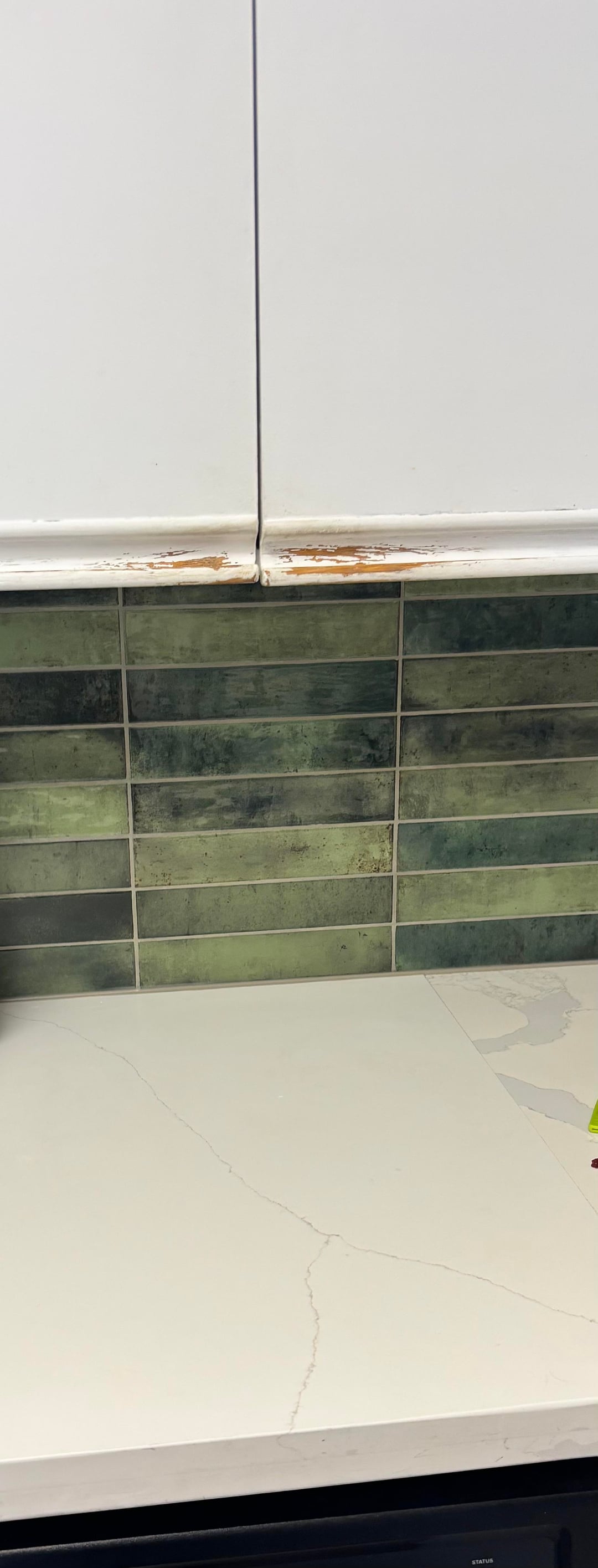 I would pick a color that is subtle but not white. A warm cream or a yellow green would look nice with that back splash. I’m outside in sunny light so I may be off on what I see 😆. If possible cabinet handles would be nice too.
