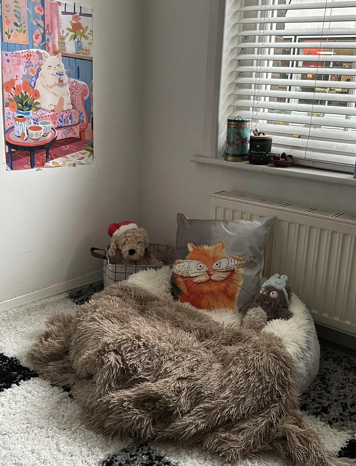My room is really small and I’ve always wanted one of those big floor loungers, but they’re either too expensive or too bulky for the space. I also didn’t want to deal with second-hand furniture. So I tried something a bit random… I bought an oversized pet bed on shein and turned it into my own little reading corner.