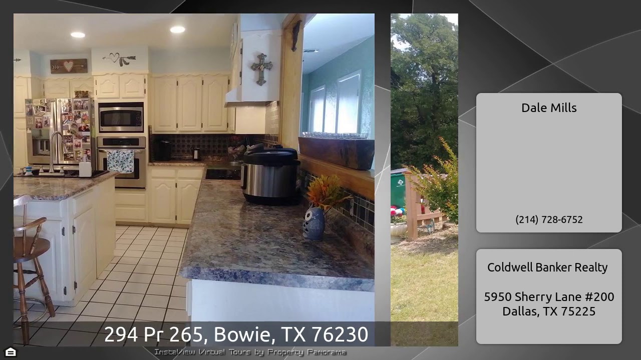 The Virtual Tour for the property at 294 Pr 265, Bowie, TX 76230 listed for $215,000: Other homes for sale by Dale Mills of Coldwell Banker Realty: Charming property on 5 plus acres with pens, pond and storage building on rolling terrain with trees. Updated kitchen with stainless appliances and center island. Open concept with dining and living. Wood burning fireplace. Tile floors. French doors open to covered patio. Very private in feel on a dead end road only one mile off Hwy 287 and close to town for convenience. Wise Electric. A perfect country place.