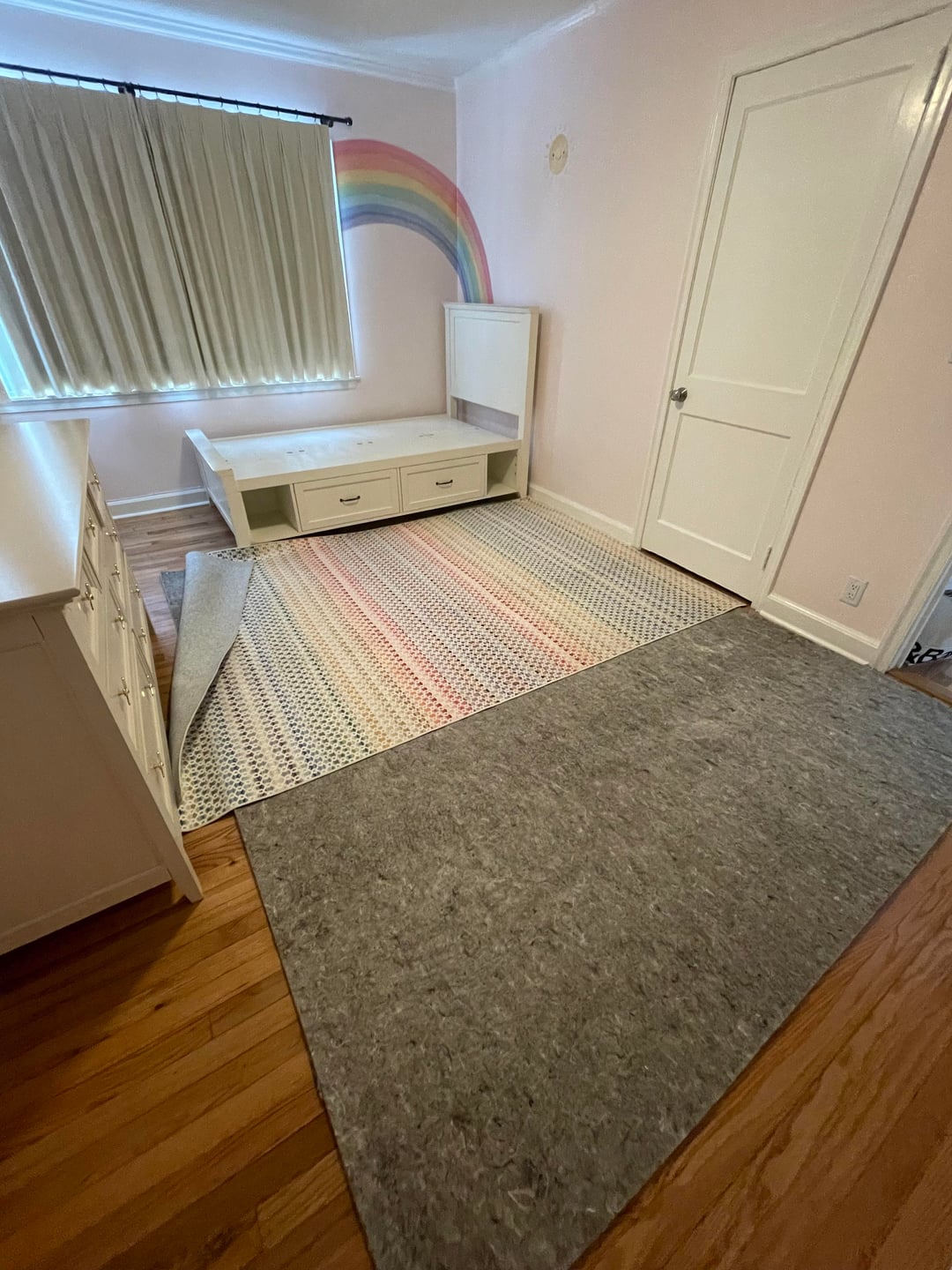 Have an entire house to set up and buy stuff for and I'm overwhelmed. Which direction and size rug should I go for? Top rainbow rug is 6×9; bottom gray rug padis for a 8×10 rug. Also what is the correct direction for the rug? I'm coming from a small apartment with no rug use. Thanks!