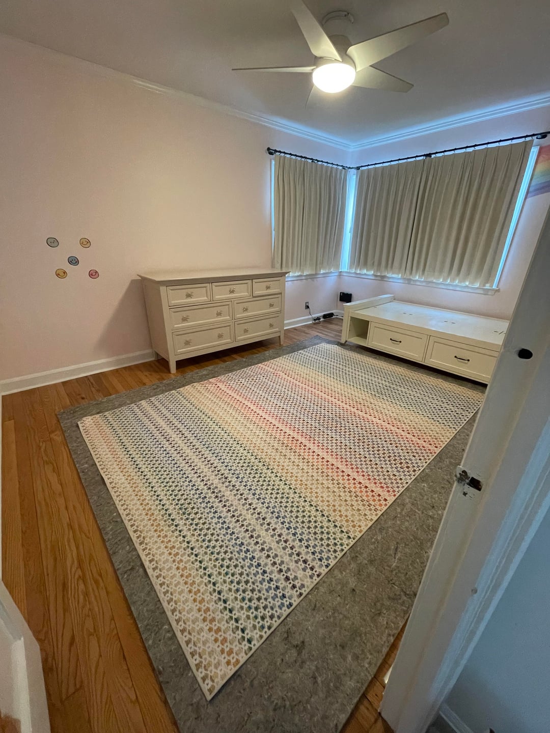 If this is a room for a little girl I’d go with the smaller rug in the direction it’s in pic 2.