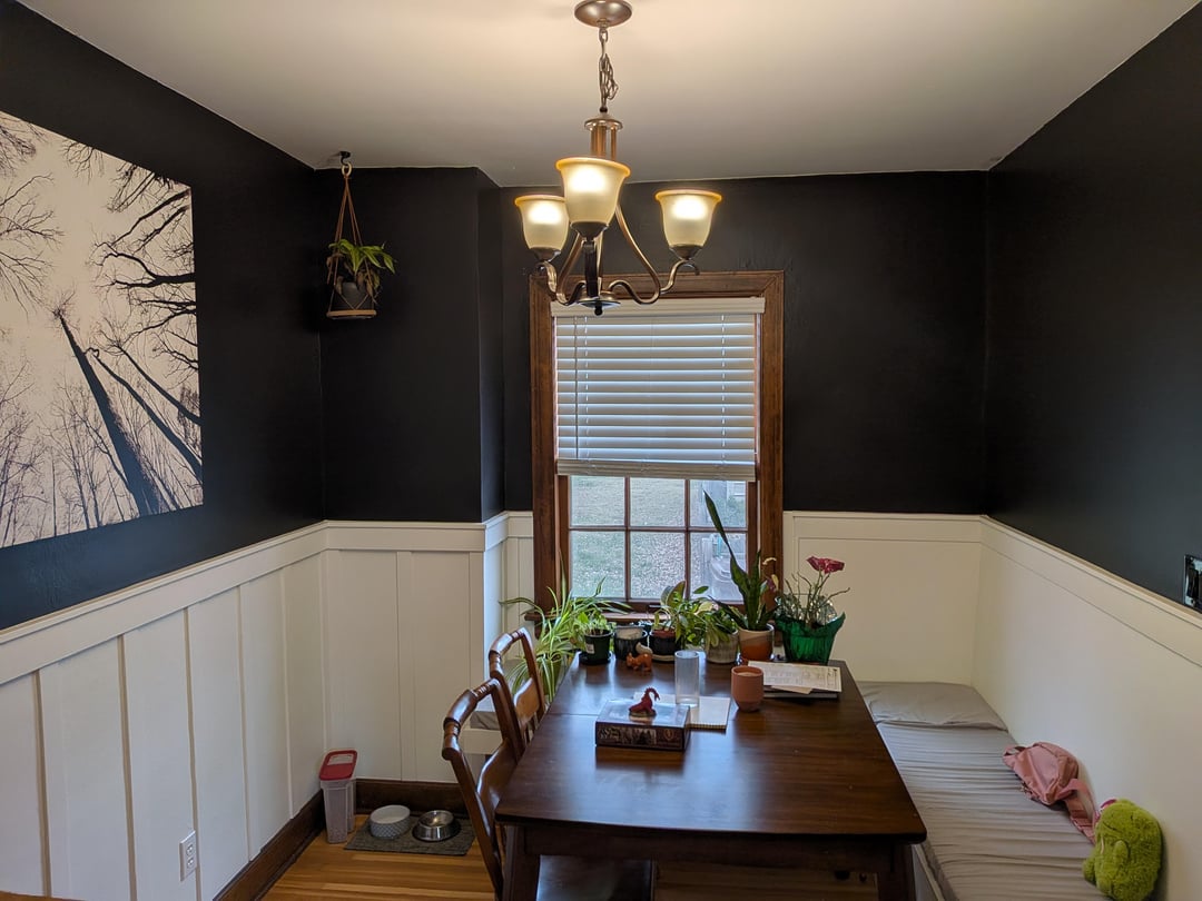 Have you considered bringing in some prints? A check or light floral curtain would be a great replacement to plastic blinds. Could also tie in with a cover for your bench cushion or added pillows to make that area more cozy! I would also consider upgrading the light fixture since it is such a focal point!