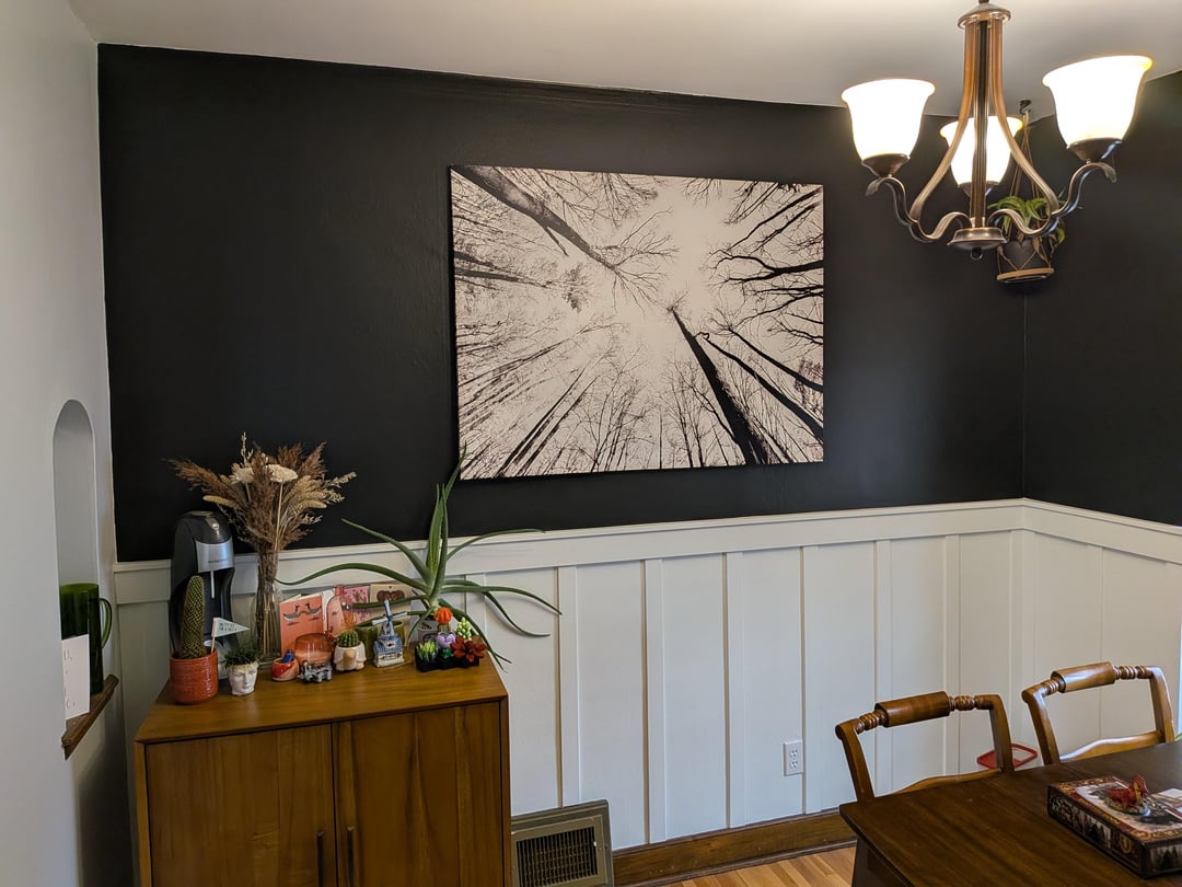 If it were mine, I’d center the little cabinet under the painting and find an interesting light fixture on FB marketplace or Craigslist. The one that’s there looks like Home Depot, which is okay but not fun.