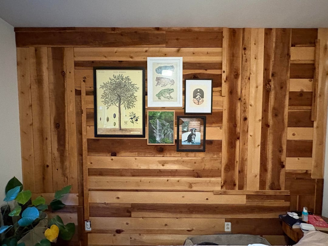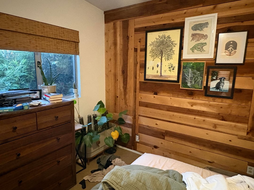 We’re leaning more towards a cozy organic eclectic vibe. Our comforter is a sage linen. I have a bunch of post cards from national parks that I would like to incorporate as well if possible on the wall. There will be lots of walnut and maple wood in the room too if that info helps. I can probably put floating shelves on the walls without causing too much damage, so I’m thinking of doing some of those and putting plants on them. What is the best way to decorate this wall to create a nice cozy vibe? What kind of floor lamps would look good in here too?