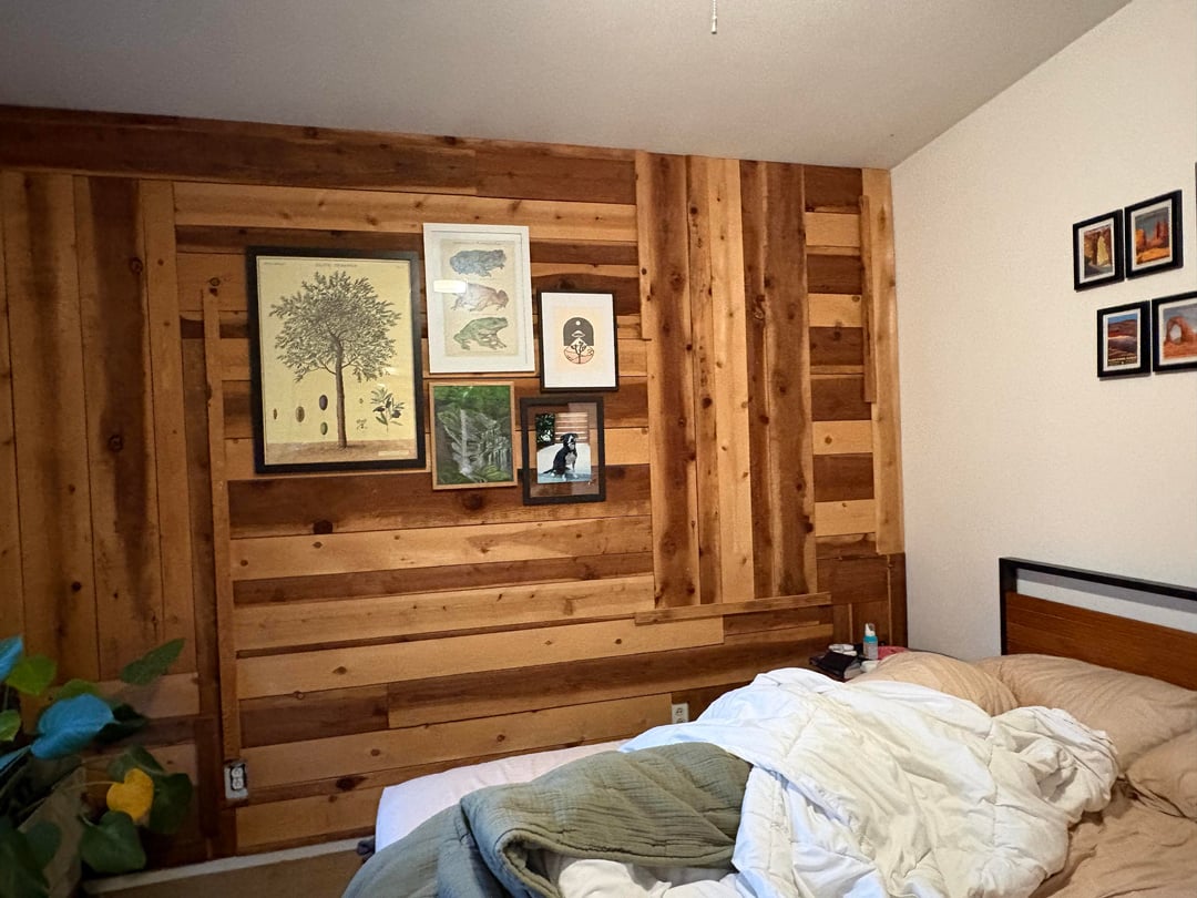 I currently rent a house that has a somewhat awkward and haphazard wooden accent wall in the main bedroom (see pictures of what I currently have). I am considering putting my bed up against that wall, but it will have to be off center to accommodate the dresser on one side of the room, is this okay? Is it better to center art on the bed or on the wall?