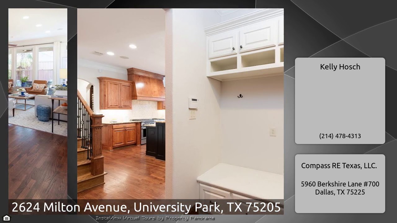 The Virtual Tour for the property at 2624 Milton Avenue, University Park, TX 75205 listed for $1,325,000: Other homes for sale by Kelly Hosch of Compass RE Texas, LLC.: Spacious traditional five-bedroom home in University Park! Step inside the entry that leads to an office with French doors, formal living room and dining room. The kitchen has stainless appliances that opens to the family room overlooking the backyard and patio, complete with fireplace and outdoor TV. One bedroom and bath are downstairs. Master is upstairs along with three additional bedrooms, each with ensuite baths. Other …