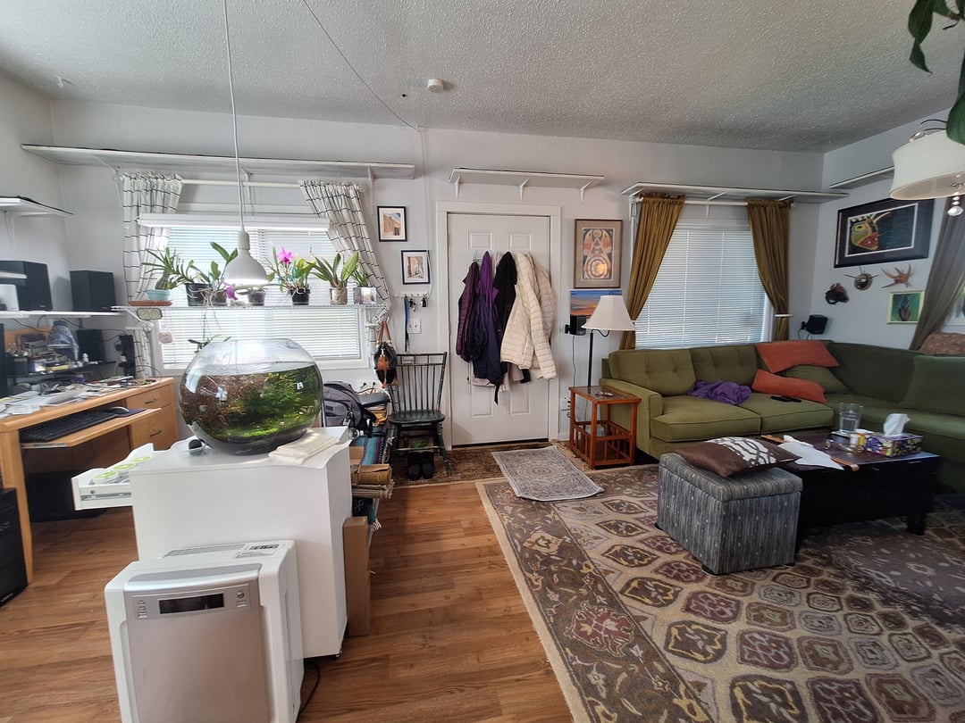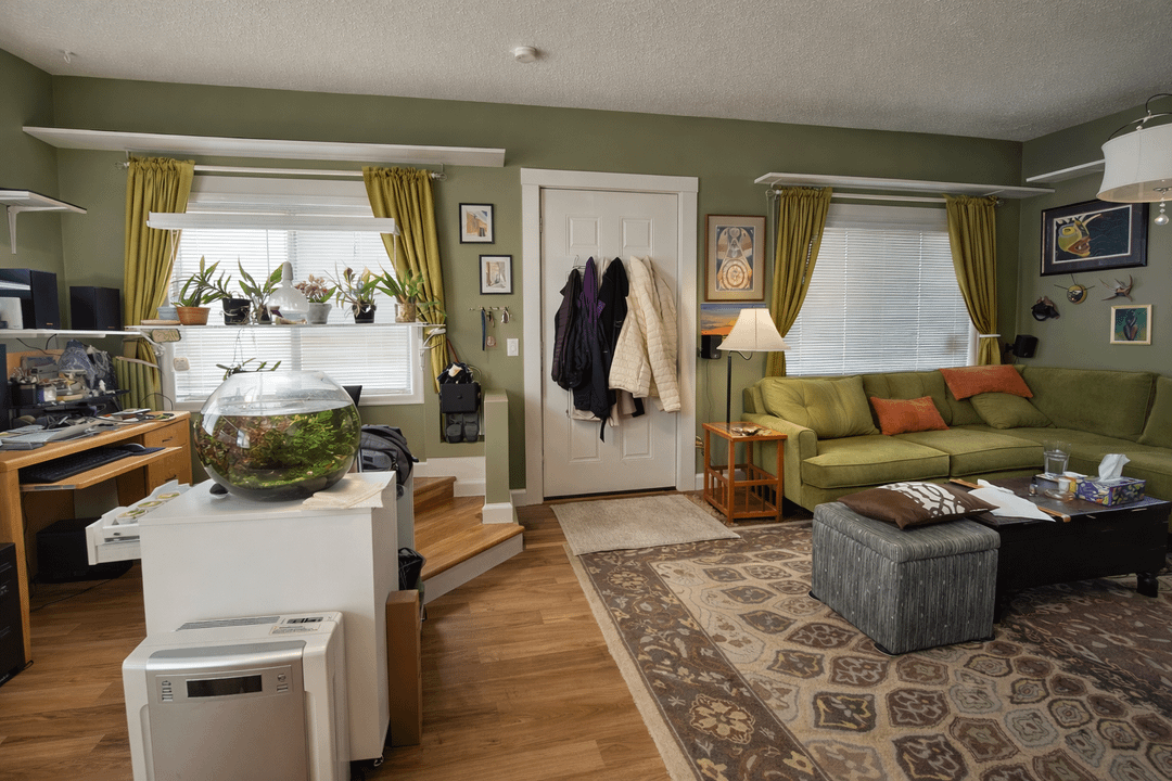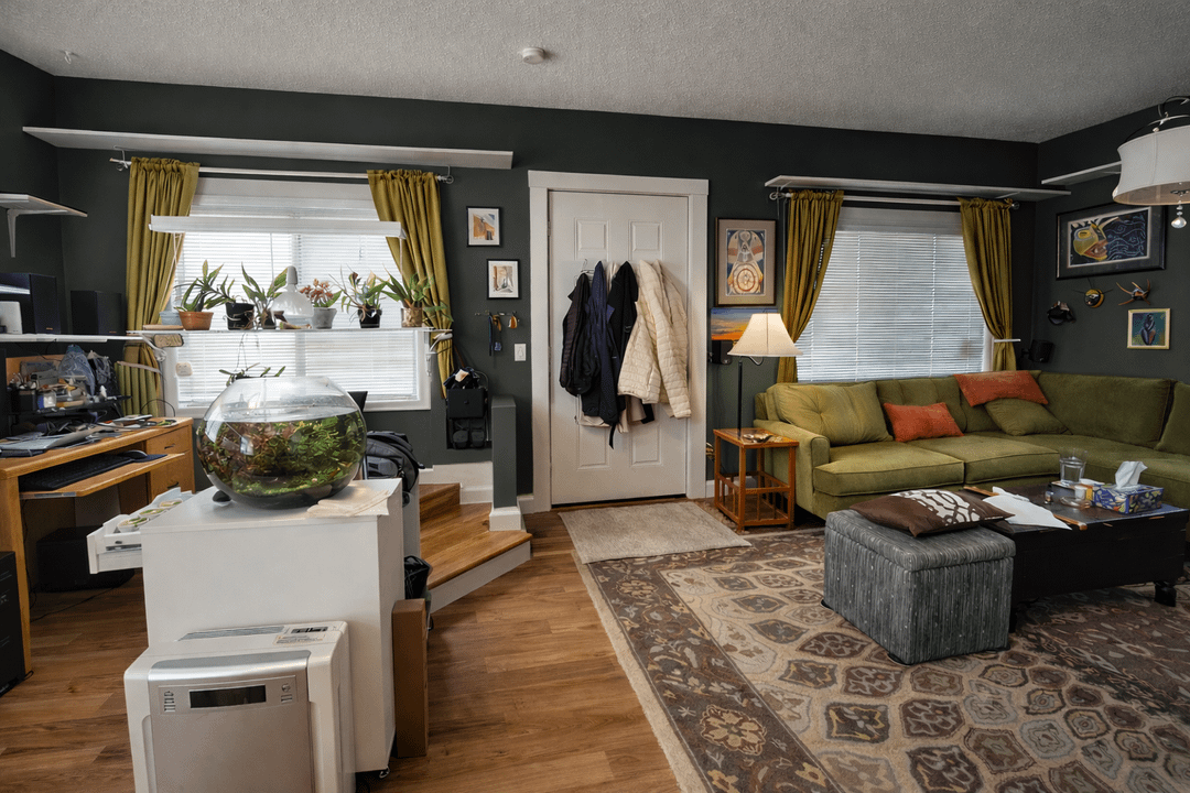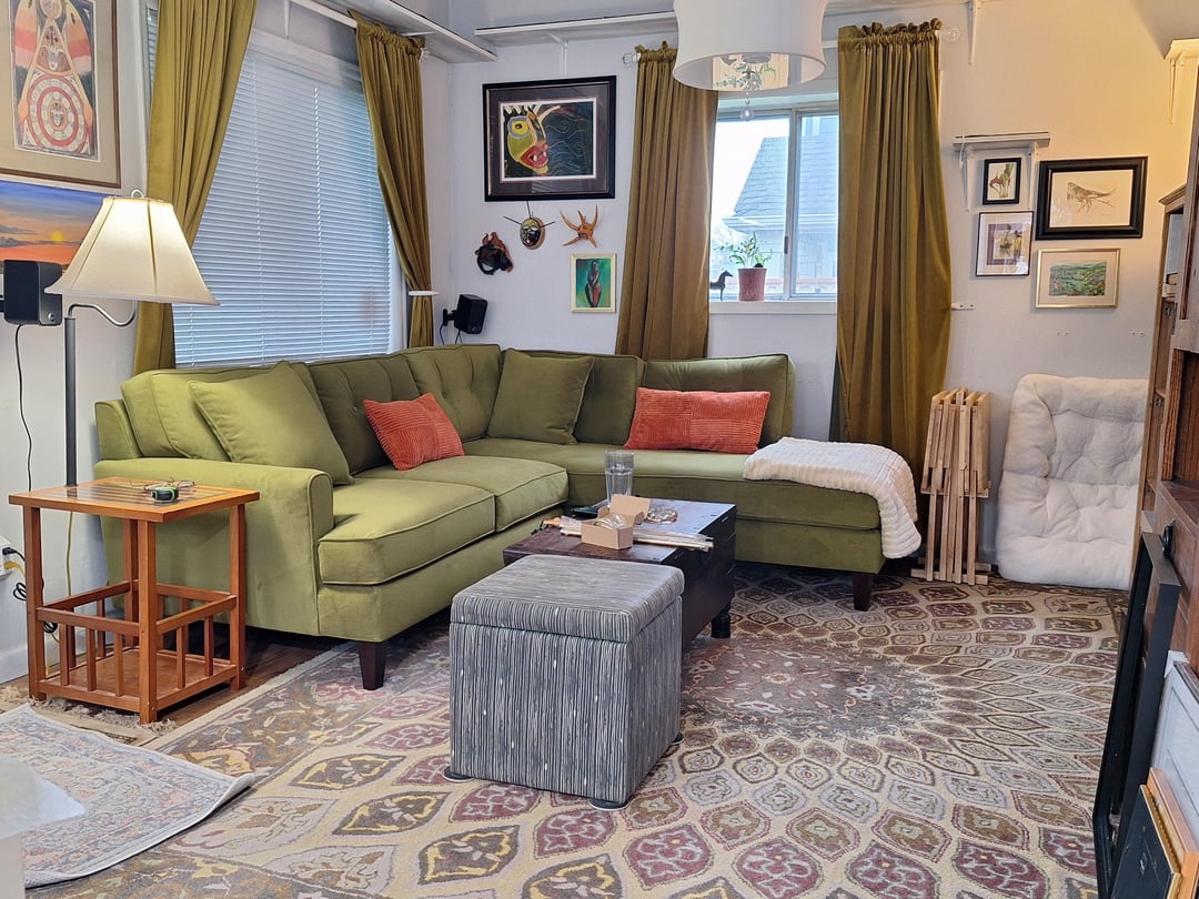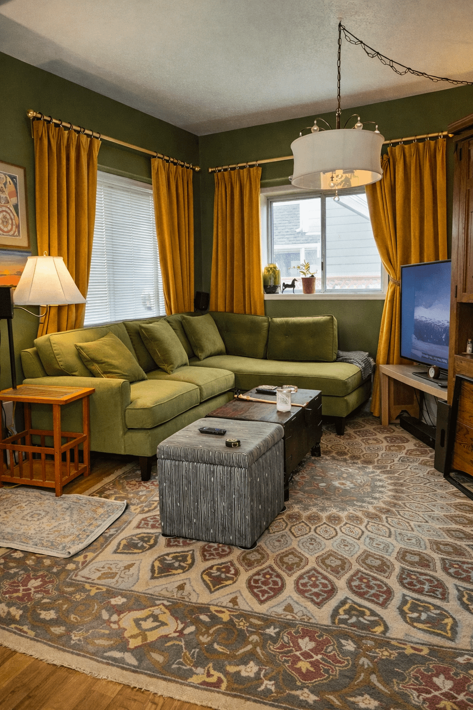 The kind people here helped me see that after getting my new sofa I *really* need to paint these walls. I plugged some photos into an image generator and got some suggestions I think I love. But, our living room is directly within our entry area, which also serves as my office space on the other side.