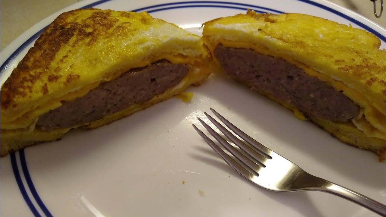 2 slices French toast with cheese and meat of your choice. We used … 2 eggs scrambled and seasoned 2 slices bread 1 slice of cheese 1 sausage party breakfastEasy recipesFranceFrenchFrench recipesRecipesandwichSandwichesToastVideoVlogYouTube