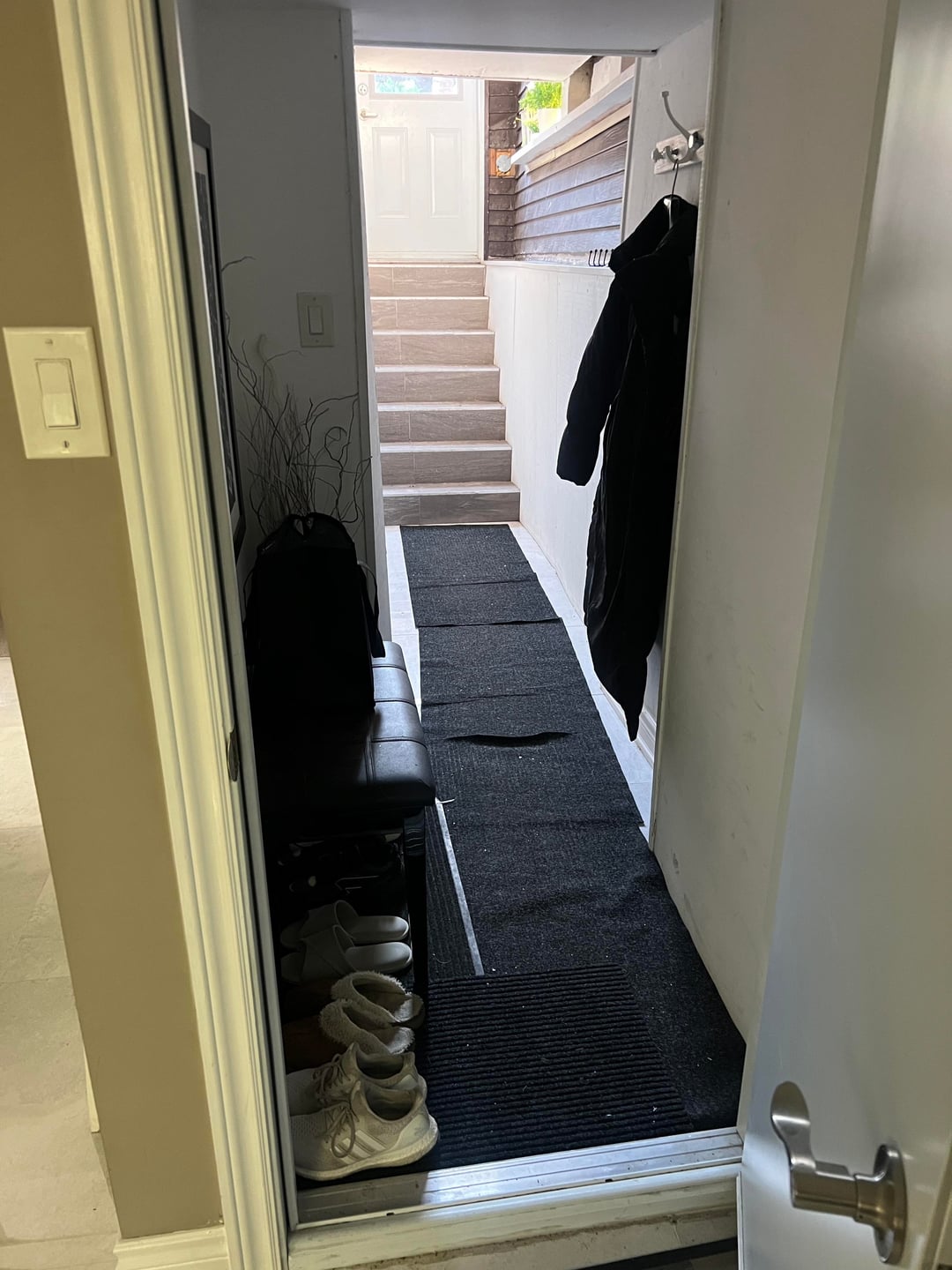 What kind of options do I have in place of these runners (which, to me, look messy) as a renter? It gets gross during the winter with boots, especially. I’m imagining a higher quality version of this kind of rug, one sheet, where I can cut it to size if I take dimensions of the floor? Maybe secure it to the floor with rug tape and to the edges of the trim? Suggestions welcome.