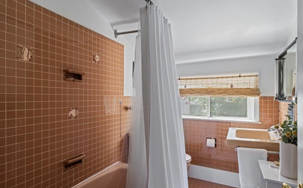 Hi! Looking for ideas to modernize this 1960s bathroom in a house we just purchased. It’s a bit small and has a sloping ceiling which make the space feel a little tight. Thinking maybe a wallpaper to go on the non-tiled walls, new shower curtain, not sure what else we can do/ would appreciate any ideas on those two items. Ideally introducing a new color that balances the salmon
