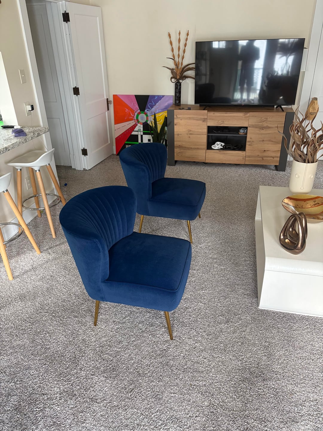 So I just moved into this apartment, and her photos of my living room. I would like any and all suggestions or advice on how to make this look better. Because the walls are uneven, I can’t Center the television stand with the rest of the room. All suggestions and advice are welcome.