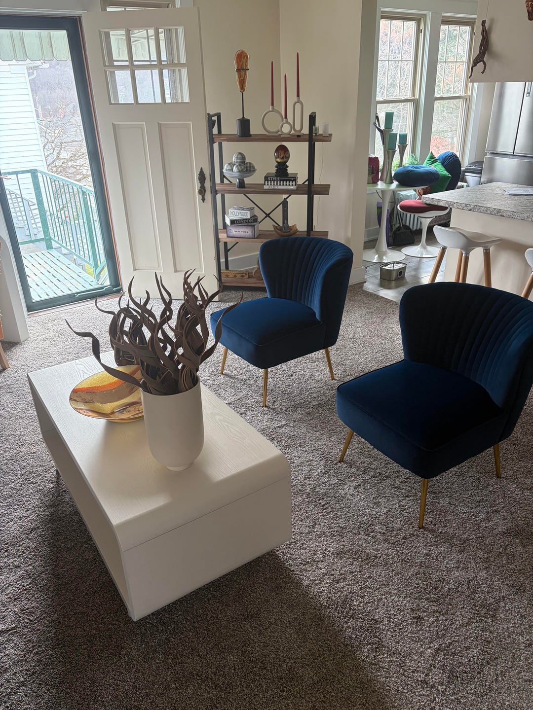 That shallow table can go where your TV is currently, and I’d get rid of that orange accent chair. I would also get rid of at least ONE of the tall dried plant-decorations you have. The tall shelf you have for decorations would also be a great place for a bar cart.