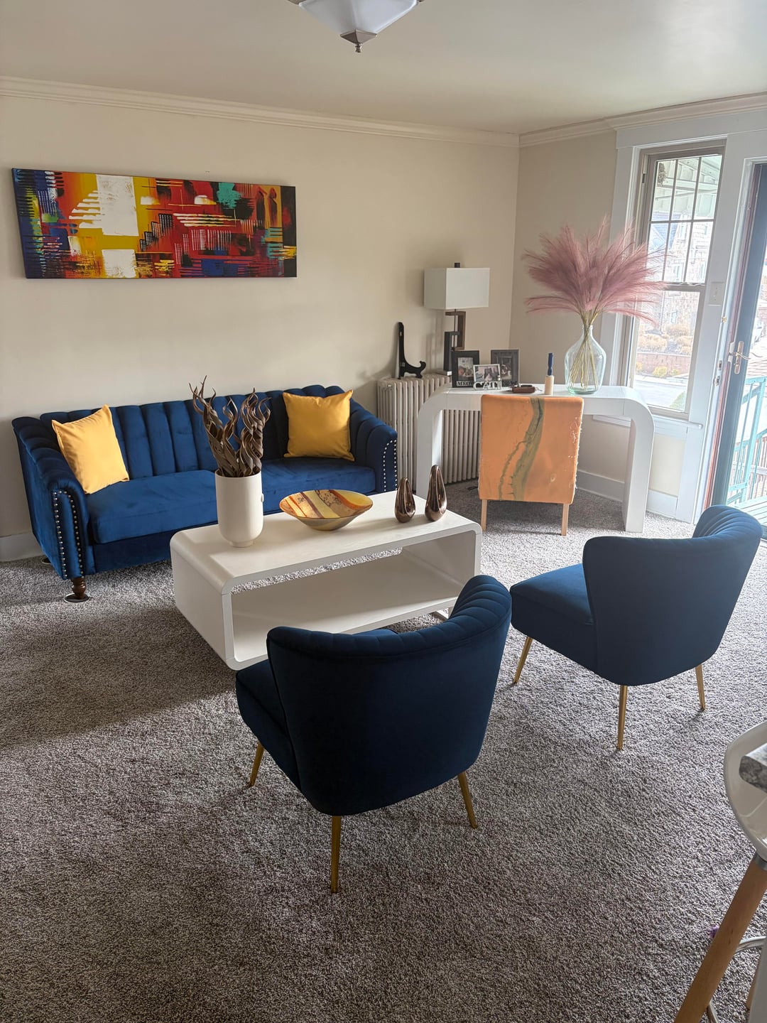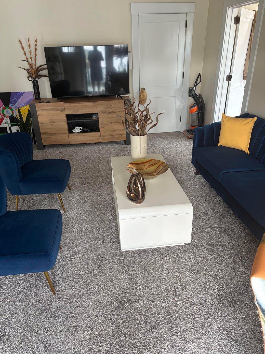 Hi! Congrats on the new spot. 🙂 While the room layout is inconvenient, i think you’ve got too much furniture, and you’re prioritizing decoration over functionality in such a small room. I’d take out one of the accent chairs and either the media center or coffee table. I’d move the TV to where the painting is, couch facing the TV, with small side tables. TV or coffee table under the TV. One accent chair near the entryway window.