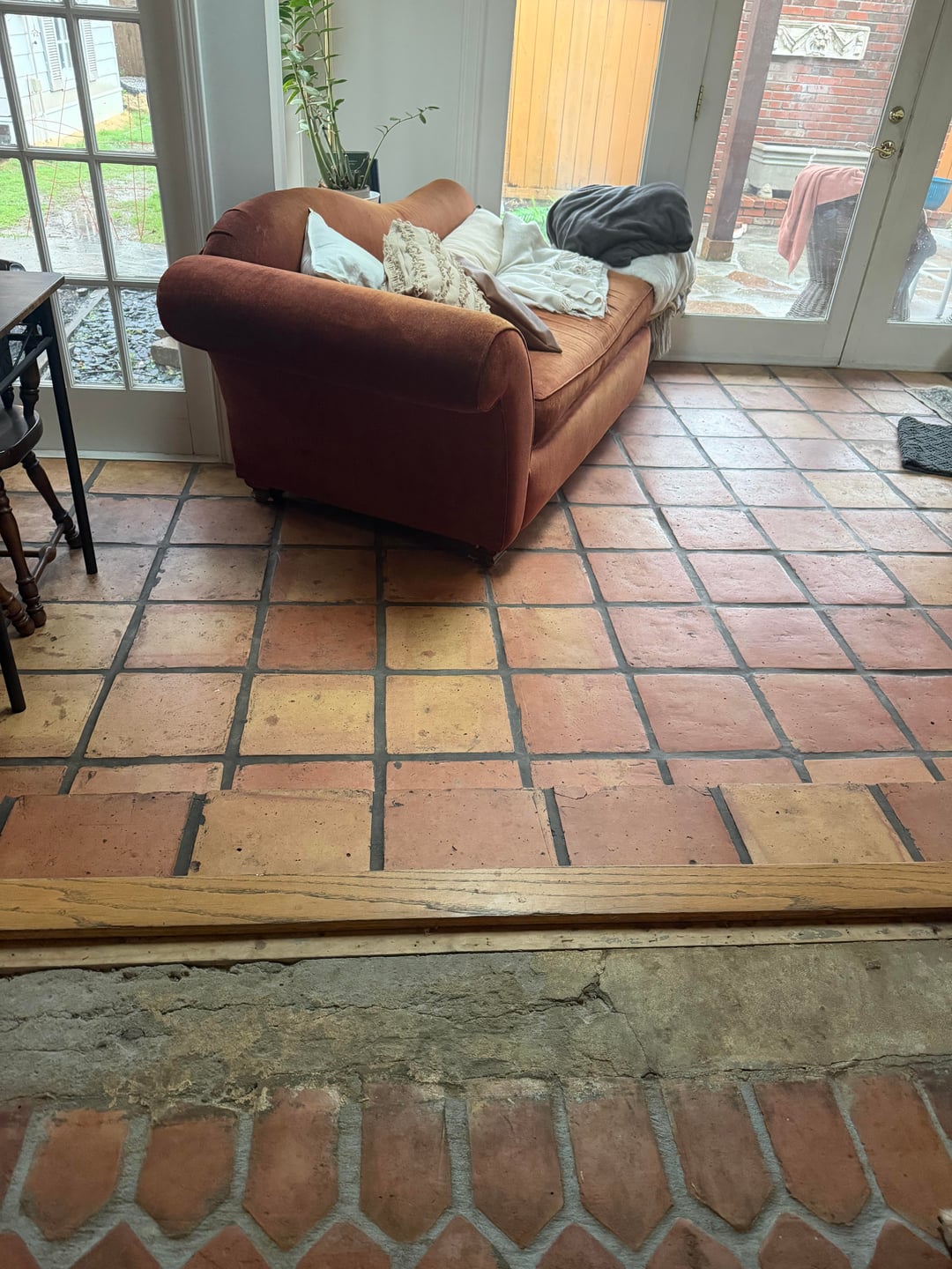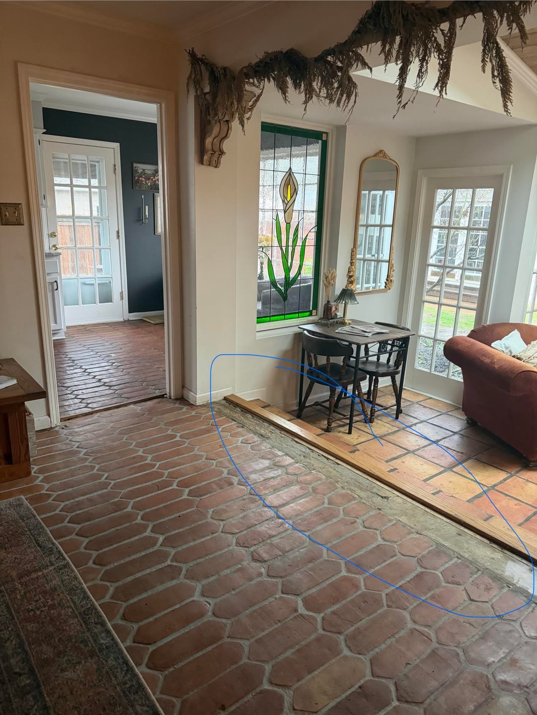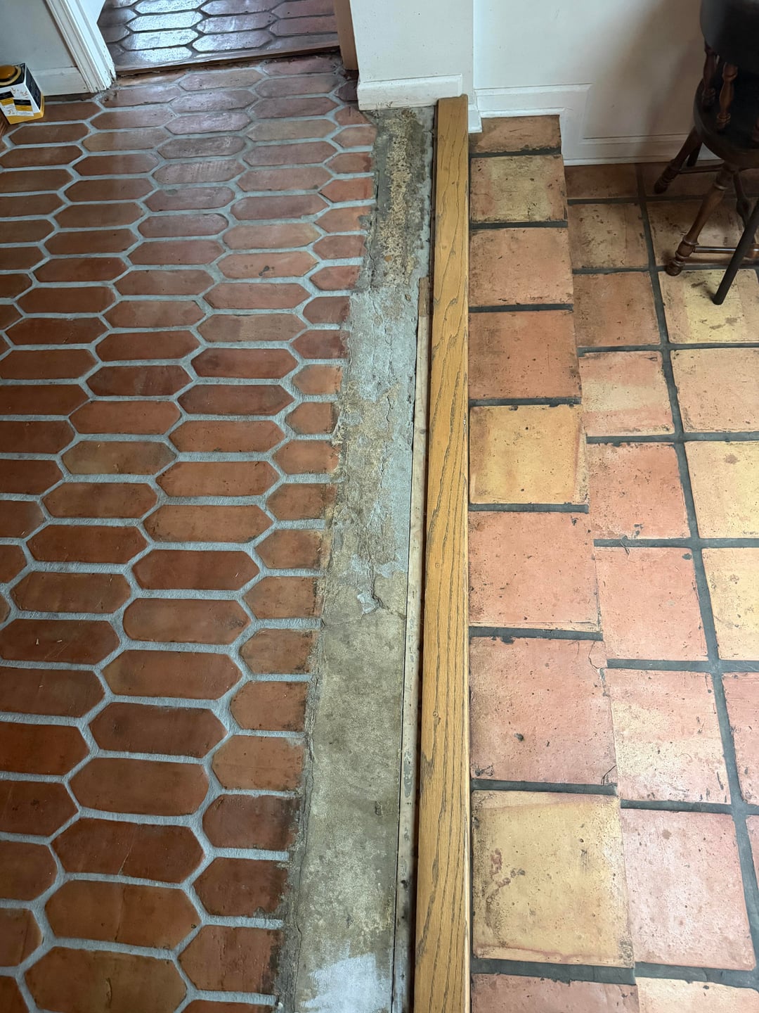 I ripped up the carpet in our living room to find this satillo tile underneath, which I restored and I love it! But, the tile does not reach the edge of the room. The owners before us put a thin wood transition piece (see photos) over part of the concrete subfloor that worked as a transition piece when there was carpet here, but it’s too narrow to cover the entire exposed concrete. I really don’t want to put down more satillo tile due to the grunt work it would require to level the floor out first. I thought about adding little white mosaic tiles, and also thought about adding white picket tile, but I didn’t like it and I thought it clashed with the satillo tile. I also thought about just buying a larger wood transition piece, but I feel like it would look too bulky. Please help! It’s driving me crazy.