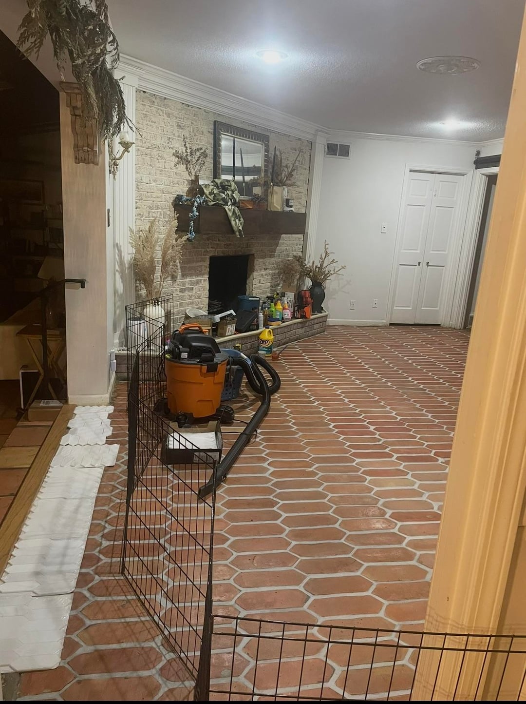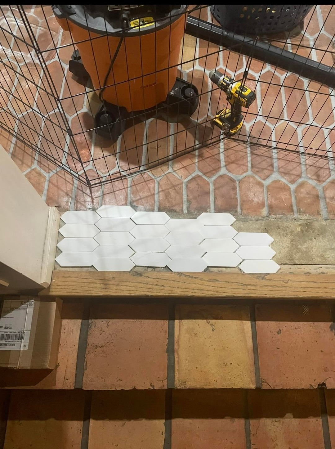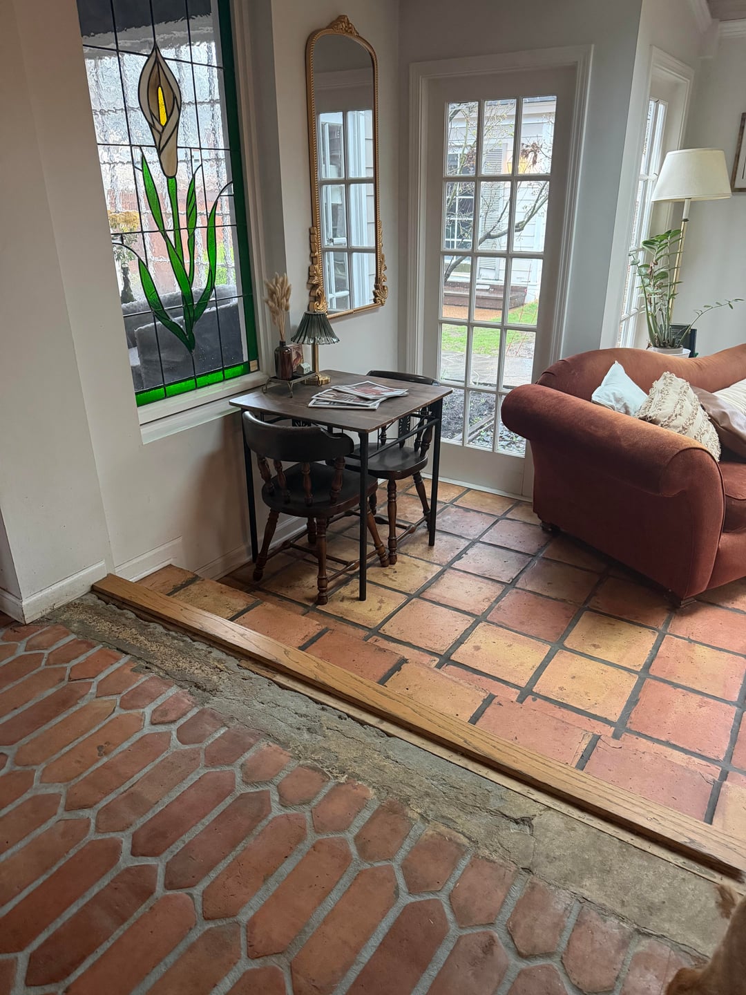 I ripped up the carpet in our living room to find this satillo tile underneath, which I restored and I love it! But, the tile does not reach the edge of the room. The owners before us put a thin wood transition piece (see photos) over part of the concrete subfloor that worked as a transition piece when there was carpet here, but it’s too narrow to cover the entire exposed concrete. I really don’t want to put down more satillo tile due to the grunt work it would require to level the floor out first. I thought about adding little white mosaic tiles, and also thought about adding white picket tile, but I didn’t like it and I thought it clashed with the satillo tile. I also thought about just buying a larger wood transition piece, but I feel like it would look too bulky. Please help! It’s driving me crazy.