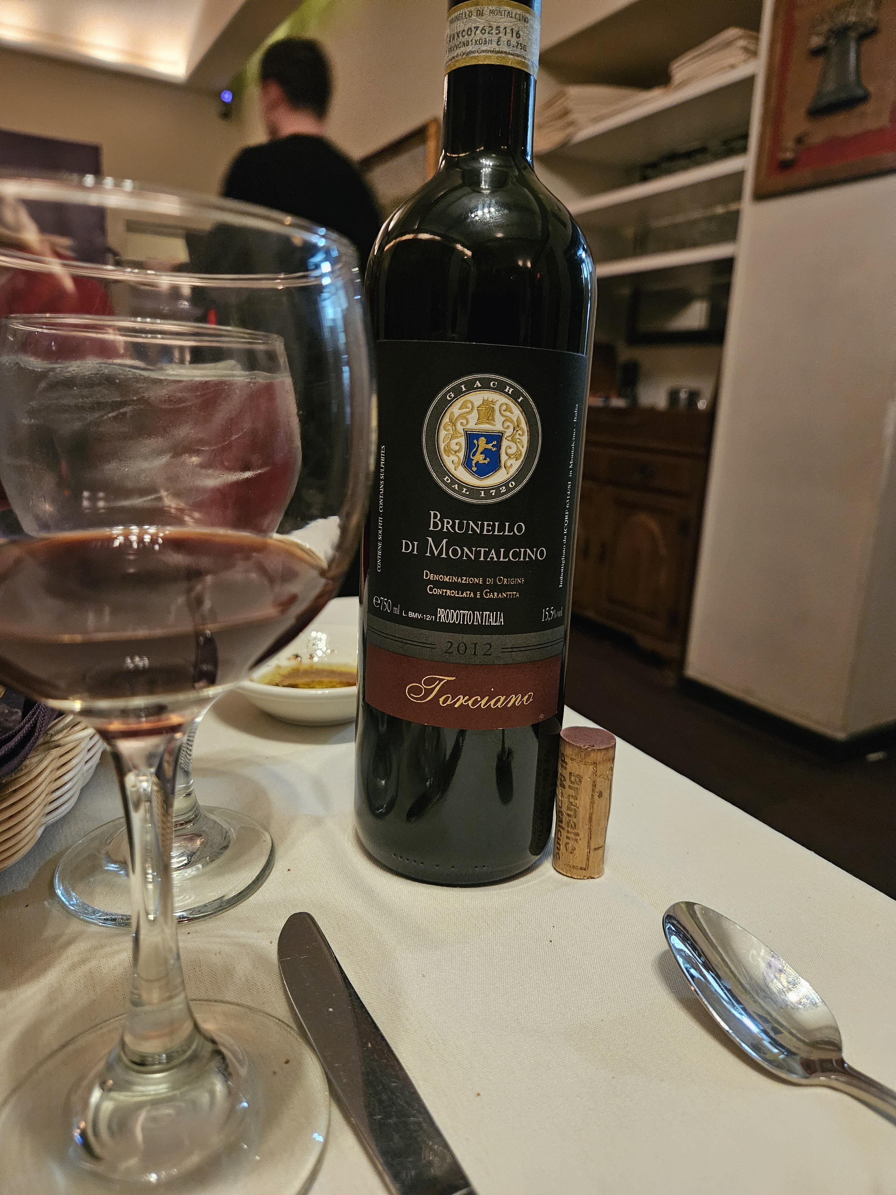 A very solid Brunello that only improved with age. Hits all of the typical qualities of good sangiovese wines-subtle, smooth red fruit, rose petals on the nose and palate. Oak influence medium, but so well-integrated. It also developed a delightfully sweet note, something like a strawberry jam, that paired perfectly with the rustic element it gained with age. Medium tannin.