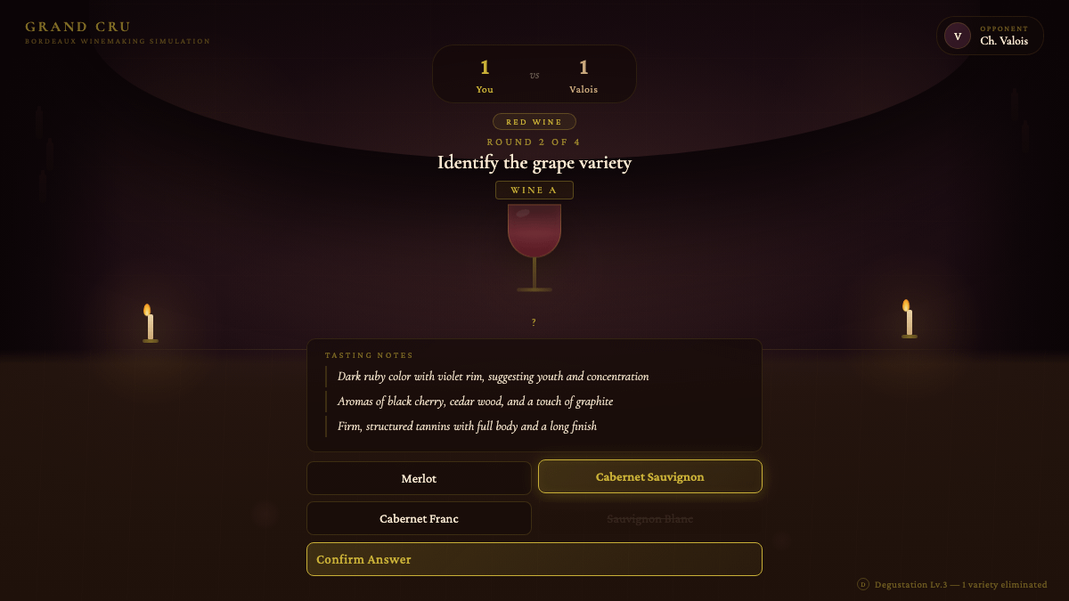 You sit down across from a rival winemaker. Two mystery wines. Six rounds. For Wine A, you get four rounds: identify the grape variety, the commune, the vintage year, and the quality tier. Then Wine B arrives — two more rounds, randomly chosen categories. Whoever gets more right wins.