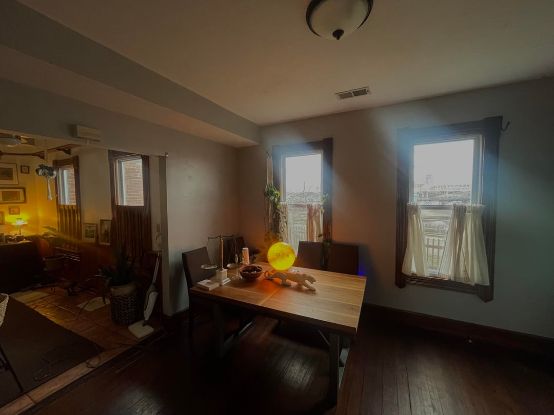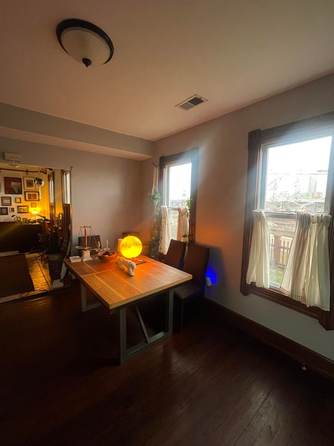 We’re playing around with the idea of buying a smaller, round table and and L shaped bench to go into this corner.