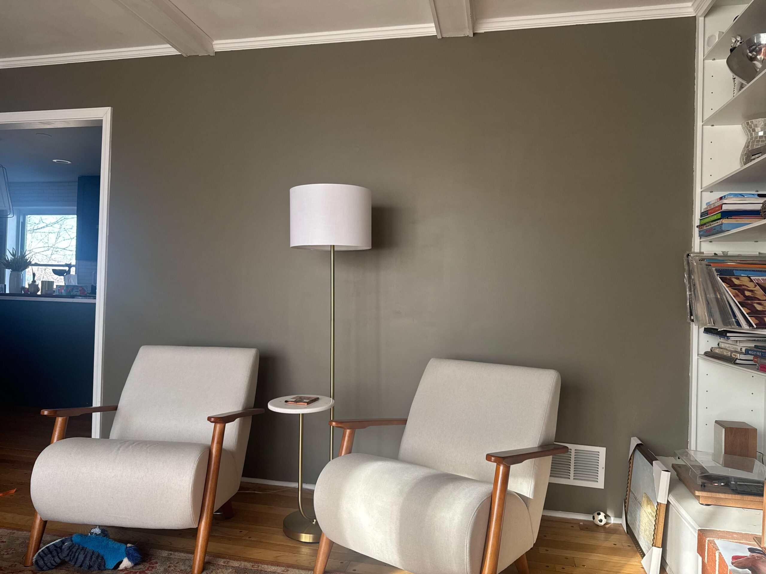 We recently updated this room from light grey walls to this rich color. We also changed our furniture, adding in these two chairs and that lamp/table combo. This wall used to have a collage of pictures all over it, but I want to update the overall look. I wasn’t planning on having that tall lamp, but I really like it and the space needs it at night. How would you decorate these walls with that lap there?