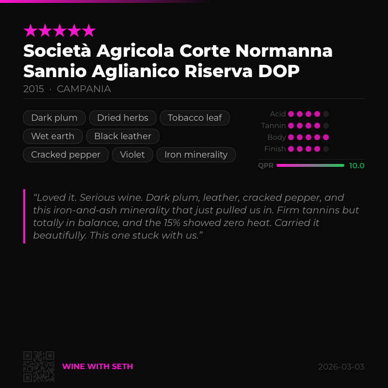 Most recently: 2015 Corte Normanna Sannio Aglianico Riserva. Serious wine. Dark plum, leather, cracked pepper, iron-and-ash minerality. Firm tannins but totally in balance, and the 15% showed zero heat. This one stuck with us. QPR was off the charts as well.