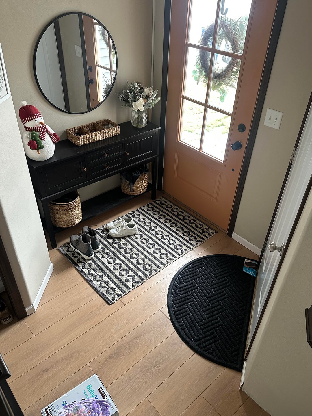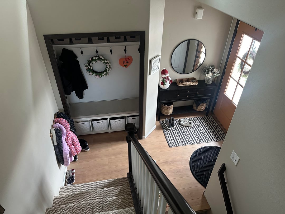 Does anyone have any ideas for what we can do for rugs by those two doors? I don’t like what we have going on and it’s also just… *not functional*. All four seasons here and we track in a lot of snow and mud and dirt throughout the year. So the rug situation needs to be absorbent. But not ugly. And we also need a place to put our dirty shoes which I can’t really figure out either? 2nd pic is the whole entry.