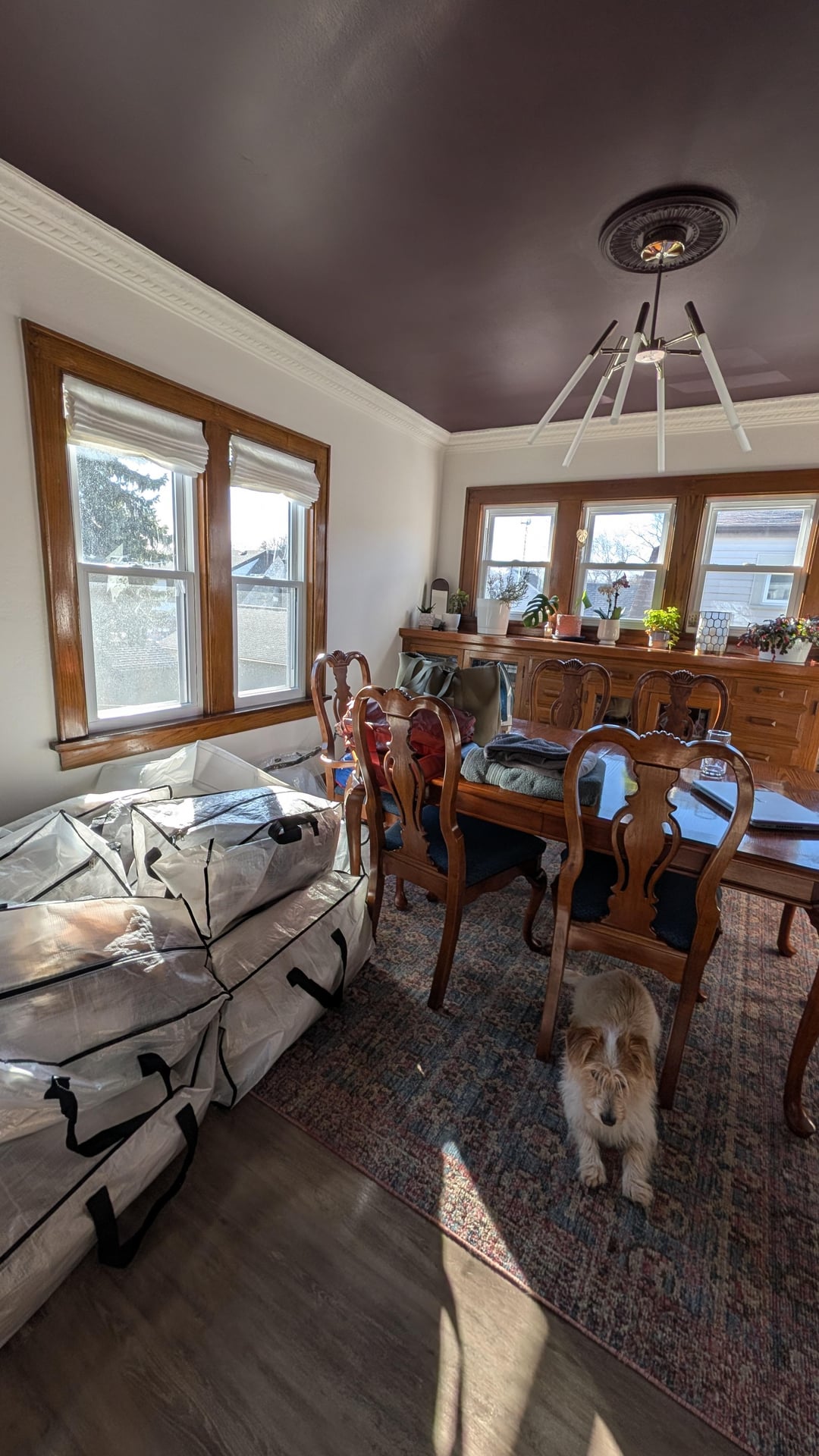 I LOVE the plum ceiling! My initial thought was to continue with another deep color in the living room, maybe a blue?