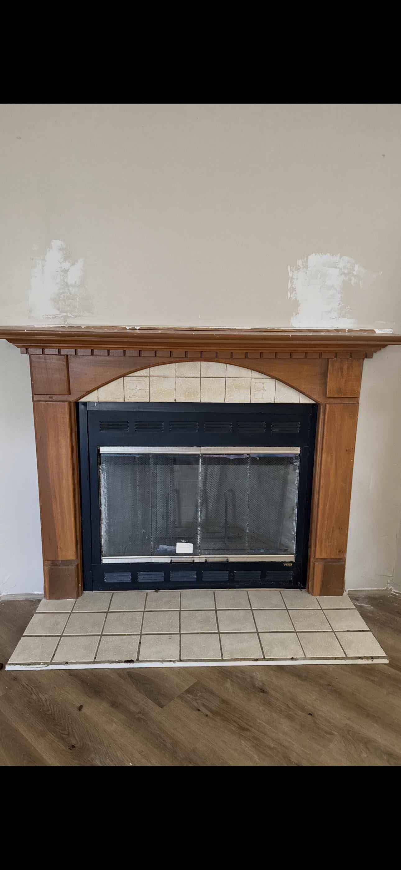 i think its a rlly nice fireplace but the different colors make it a sight sore. can you take out the wood? since you cant take out the tile/stone, if you could remove it i would say just keep the wood but make it black to match the fireplace