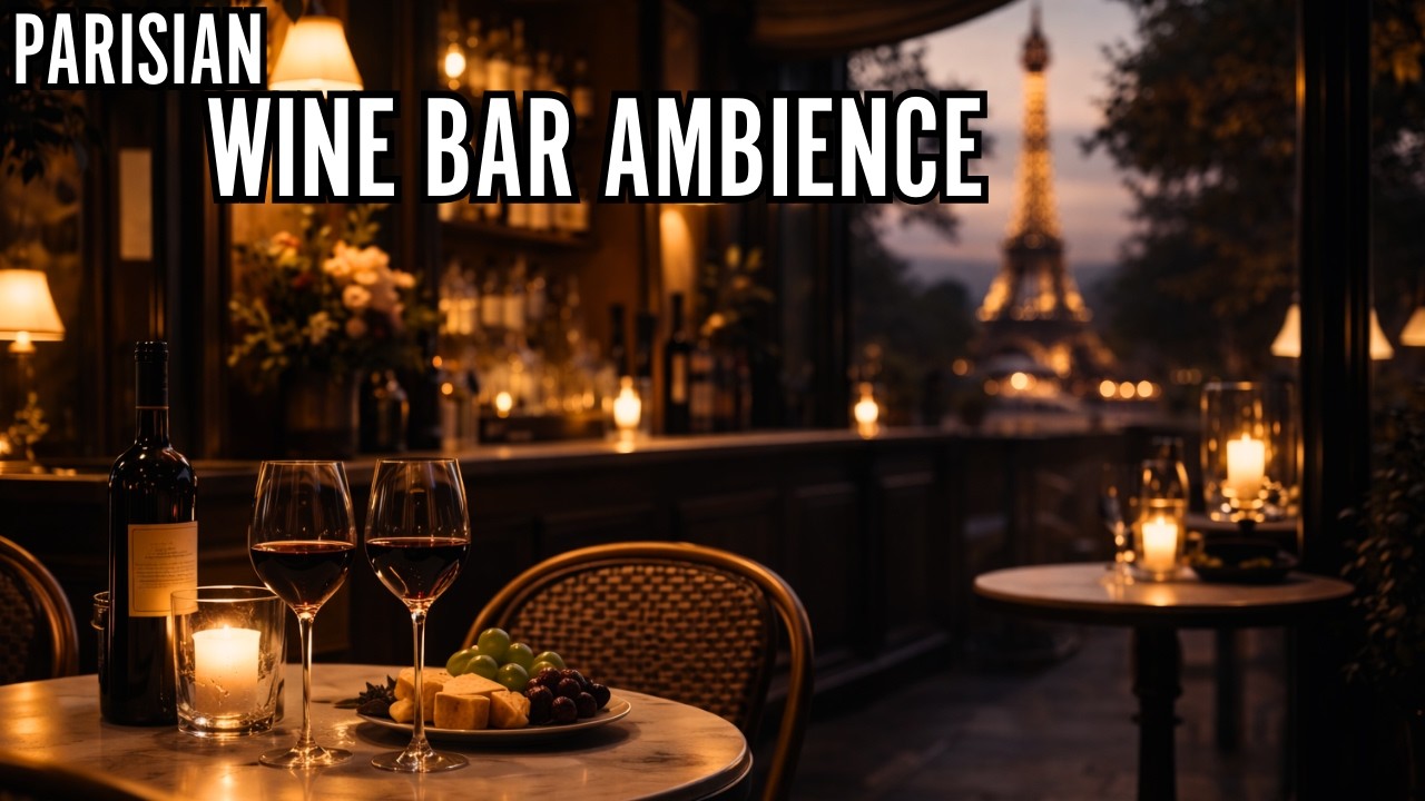 A late night in Paris, with the Eiffel Tower watching over a quiet wine bar atmosphere.