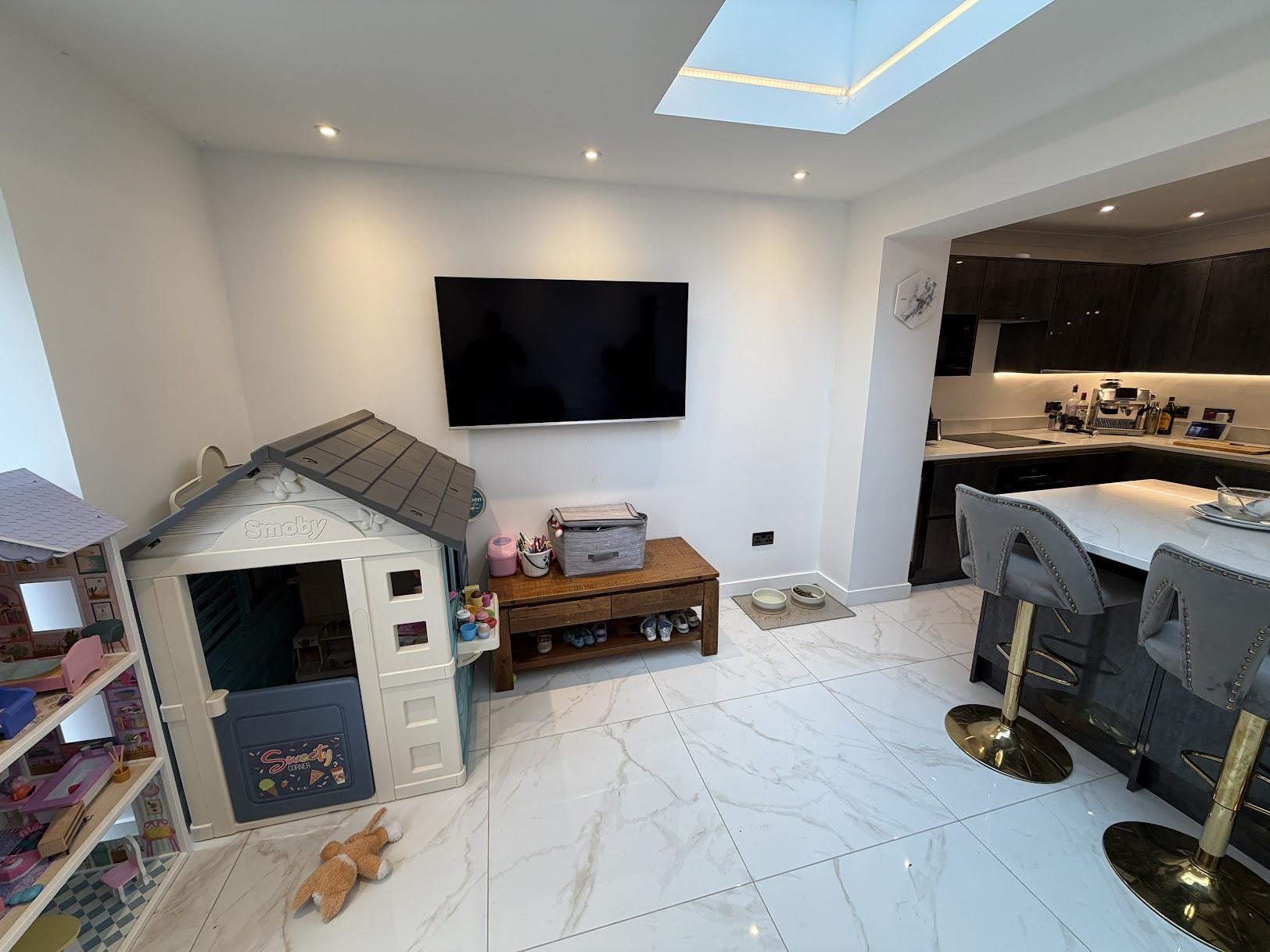 Hi all, we're really not sure what to do to add a bit of colour/make our extension walls look a bit more interesting. I've attached a pic of one of the walls, there's another on the other side which is pretty much the same but without a TV on it. Once my daughter is a bit older we're hoping to slowly move some of the toys out and into the garden/her room.