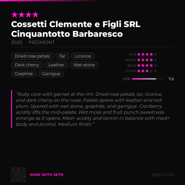 We've been on an Italian kick lately and this one delivered. 2020 Cossetti Clemente e Figli Cinquantotto Barbaresco. Dried rose petals and tar right out of the glass, dark cherry and leather on the palate, with wet stone and graphite minerality running underneath. Cranberry acidity keeps it lifted. Med+ tannins and totally in balance. Solid complexity for a ~$40 Barbaresco.