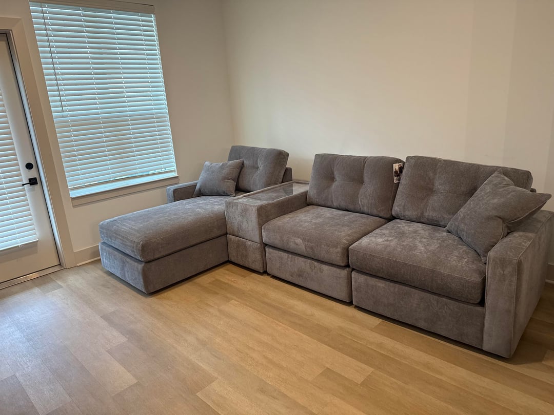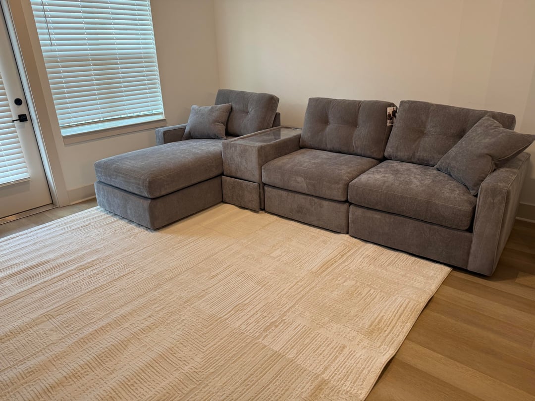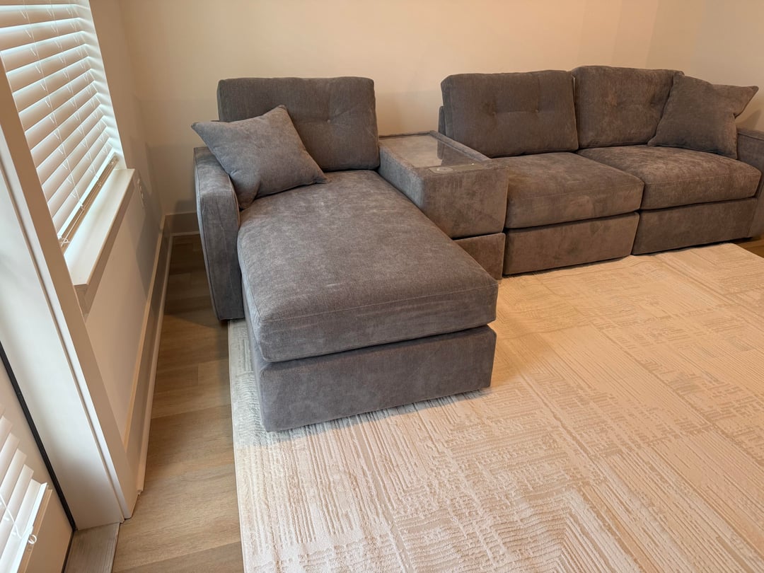 I don’t personally love how the console separates the chaise from the rest of the sofa. I would move that piece to the left of the chaise, against the wall, and see how that looks.