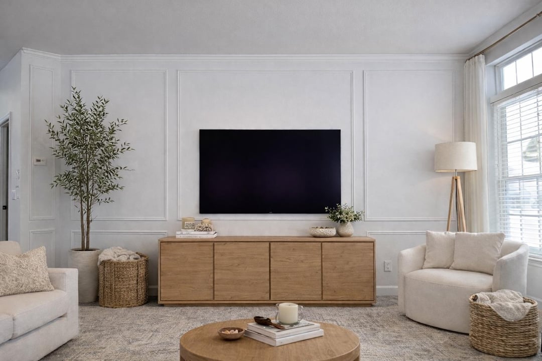 I feel like the rest of your room and the general vibe are more modern and 1 and 3 are a little more traditional feeling. I think the top right (2) has a weird shape, like I would like it more if it was as wide as 1 and 3. Of these, 4 is probably the best, I think it balances everything and maintains the more modern feeling.