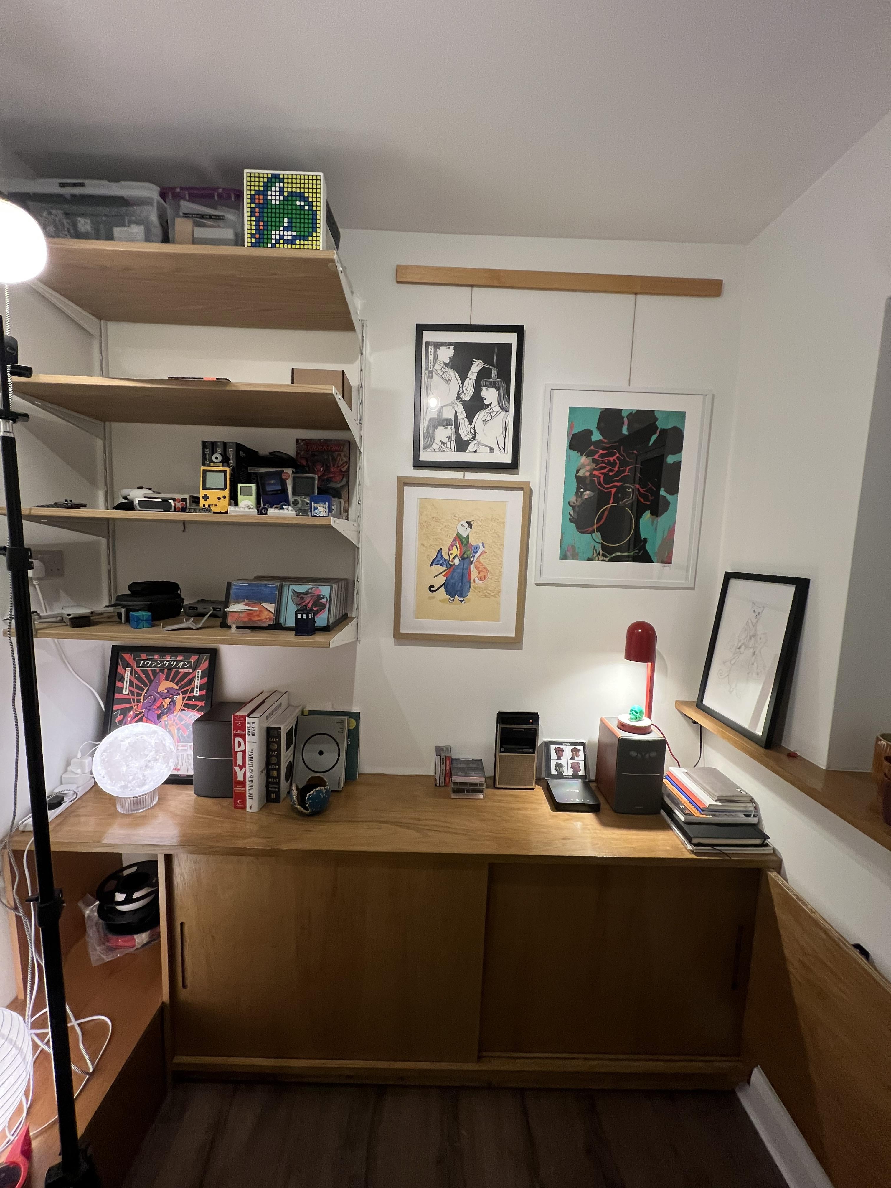 I've done the cabinet from scratch, got some Ikea shelves and made a DIY rail system for picture frames. Wanted to keep everything coherent