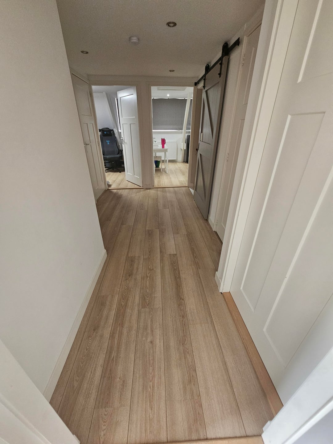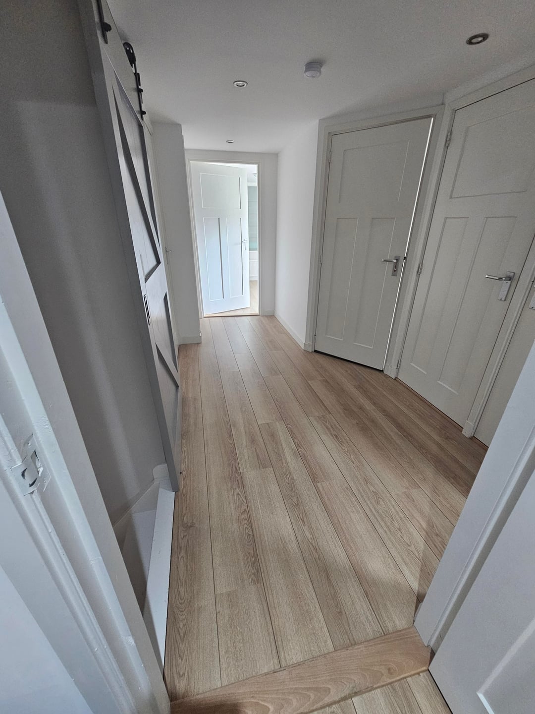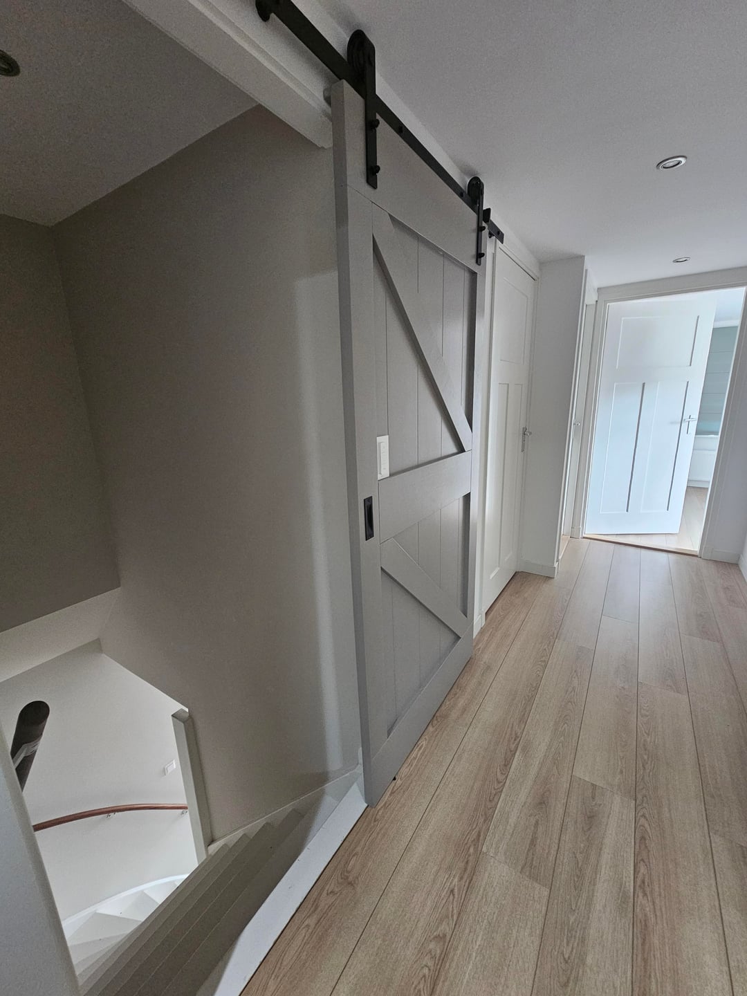 I am looking to improve this landing. It's a sea of doors (8 in total and a sliding farm style door). I am open to painting.