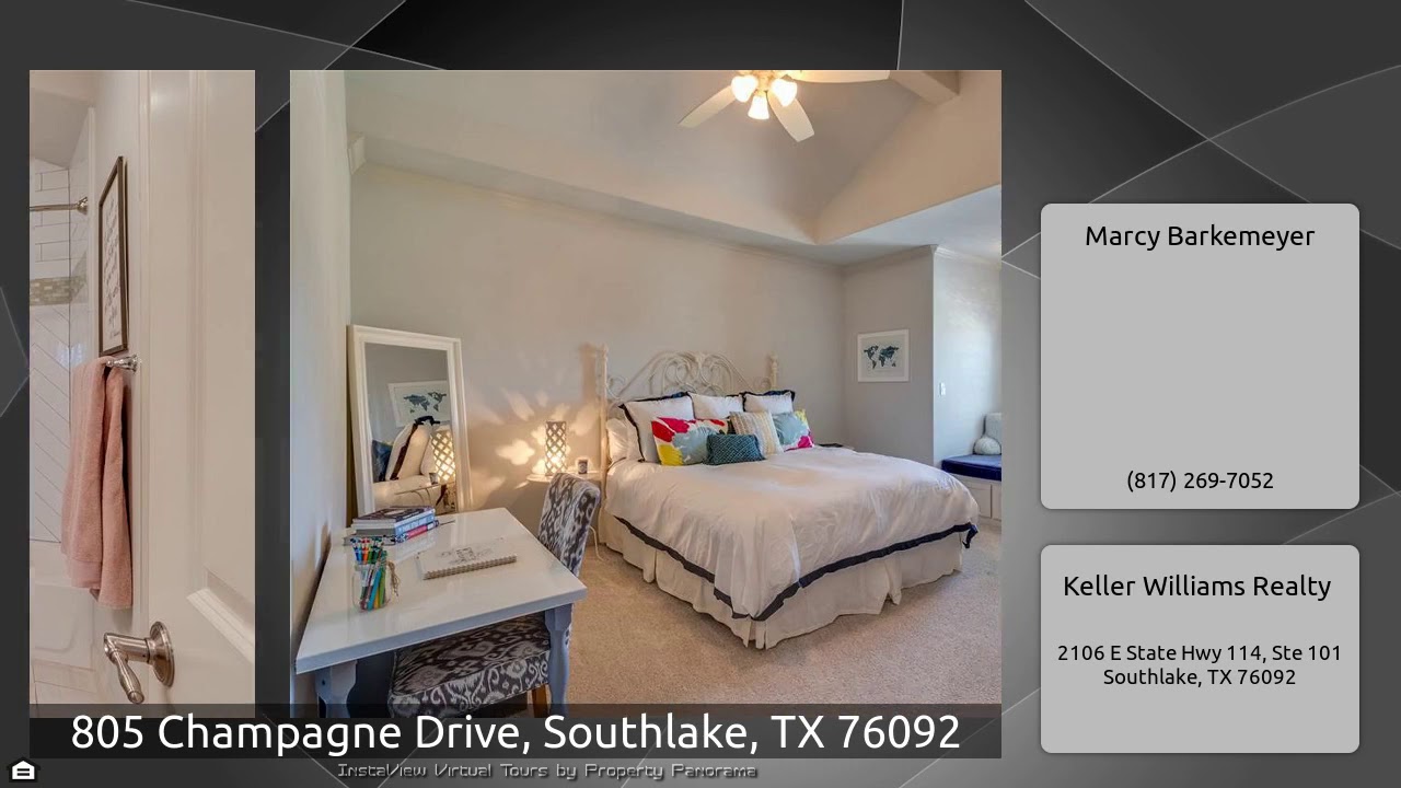 The Virtual Tour for the property at 805 Champagne Drive, Southlake, TX 76092 listed for $1,399,000: Other homes for sale by Marcy Barkemeyer of Keller Williams Realty: Gorgeous Carillon custom home. Spacious French inspired open plan is adorned with upgrades from groin vault & coffered ceilings to moldings & marble. The kitchen hosts Thermador appliances, wine refrigerator, over-sized island & breakfast bar, perfect for entertaining. Master suite features see through fireplace to bathroom featuring air tub, separate shower & large walk-in closet with steel tornado shelter. Second Master …