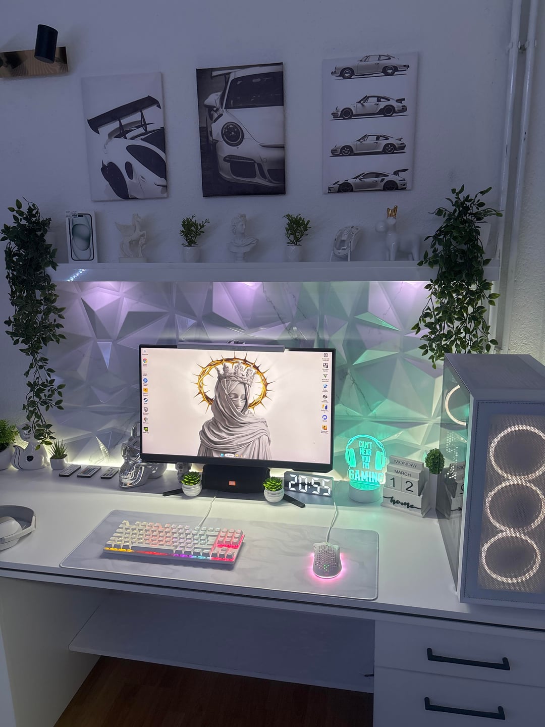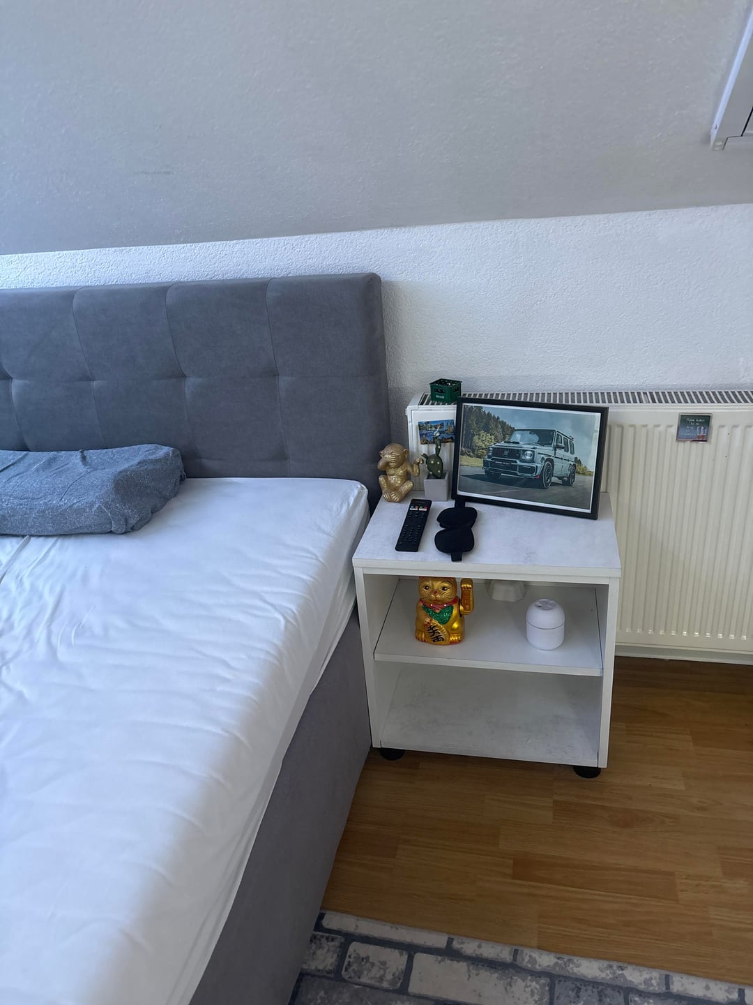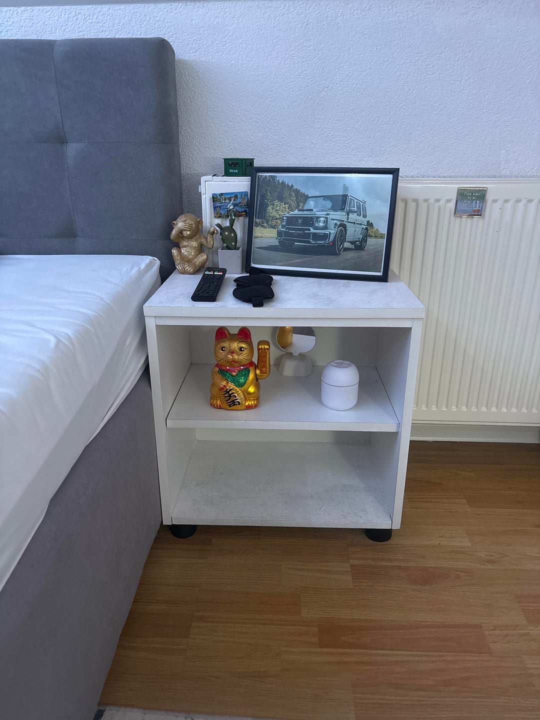 Need ideas for these 2 shelfs i want something modern all of these things dont go together and it needs to be white Im gonna put a picture of my white room setup and i want this nightstand to also be like that, the picture I need help with is the one next to the bed