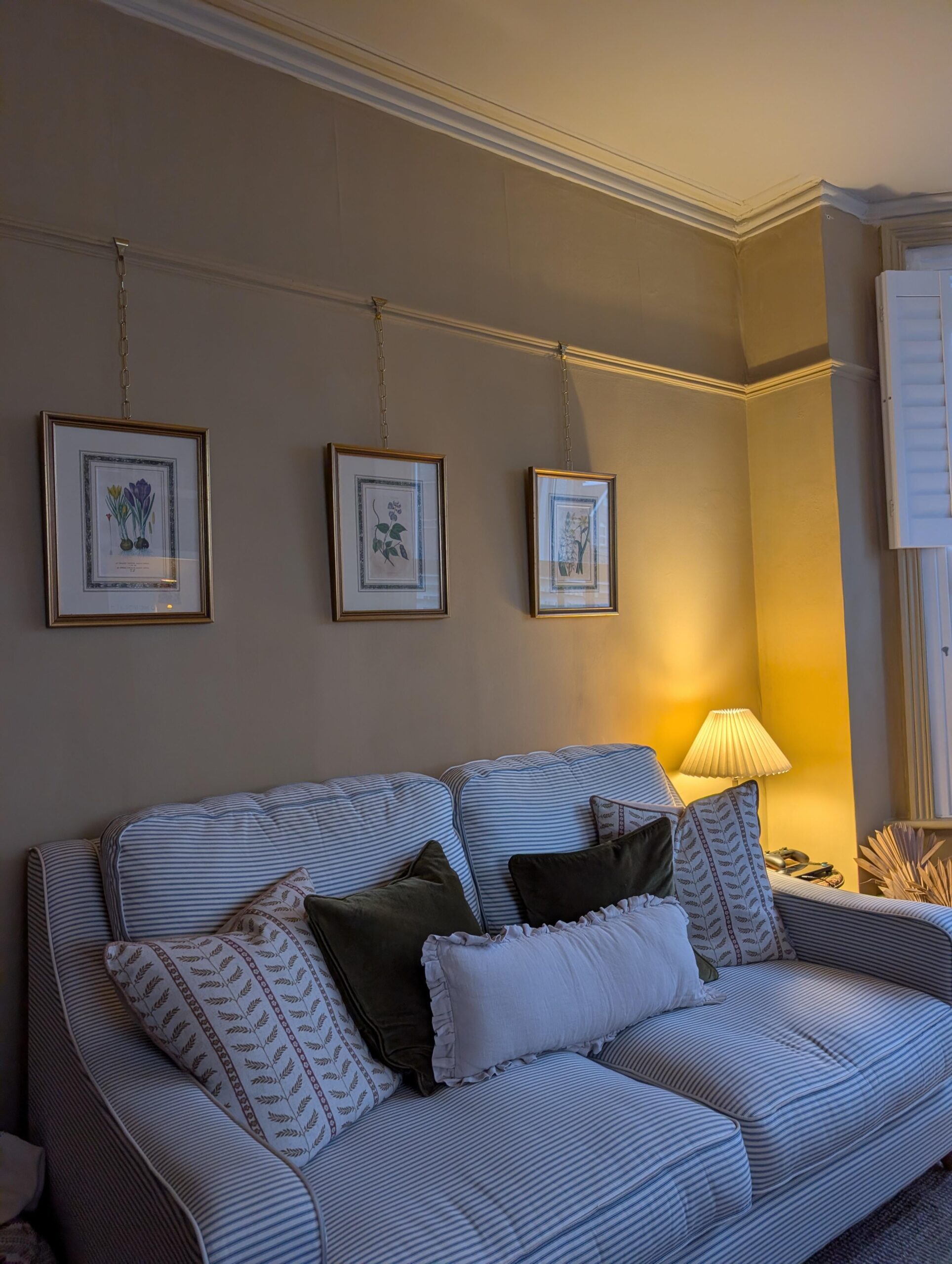 Such a cool room! I feel like if the pictures were slightly taller, the wall would look more full. I think that would bring the centerline up, but still give you good coverage.