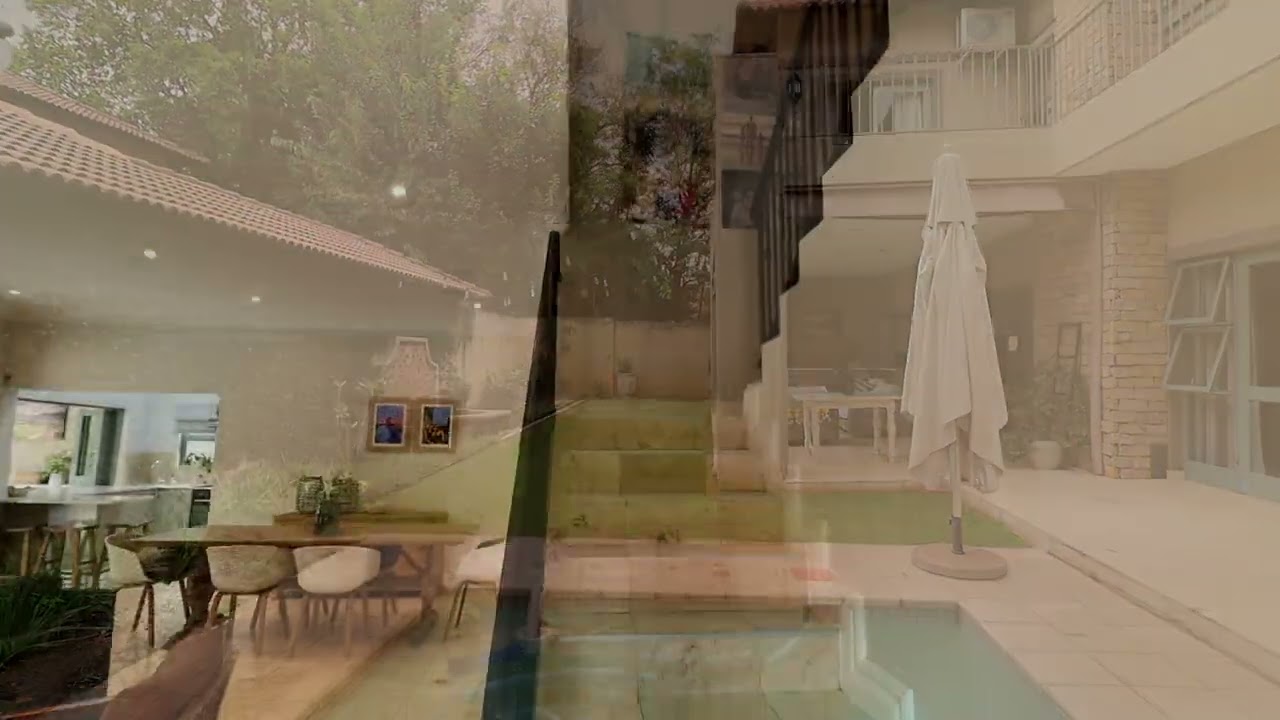 The ground floor welcomes you with expansive open-plan living spaces including a lounge, dining area and family room centred around a cosy fireplace. Large French doors open onto a covered braai patio, overlooking a private garden and sparkling swimming pool — perfect for relaxed weekends and entertaining.