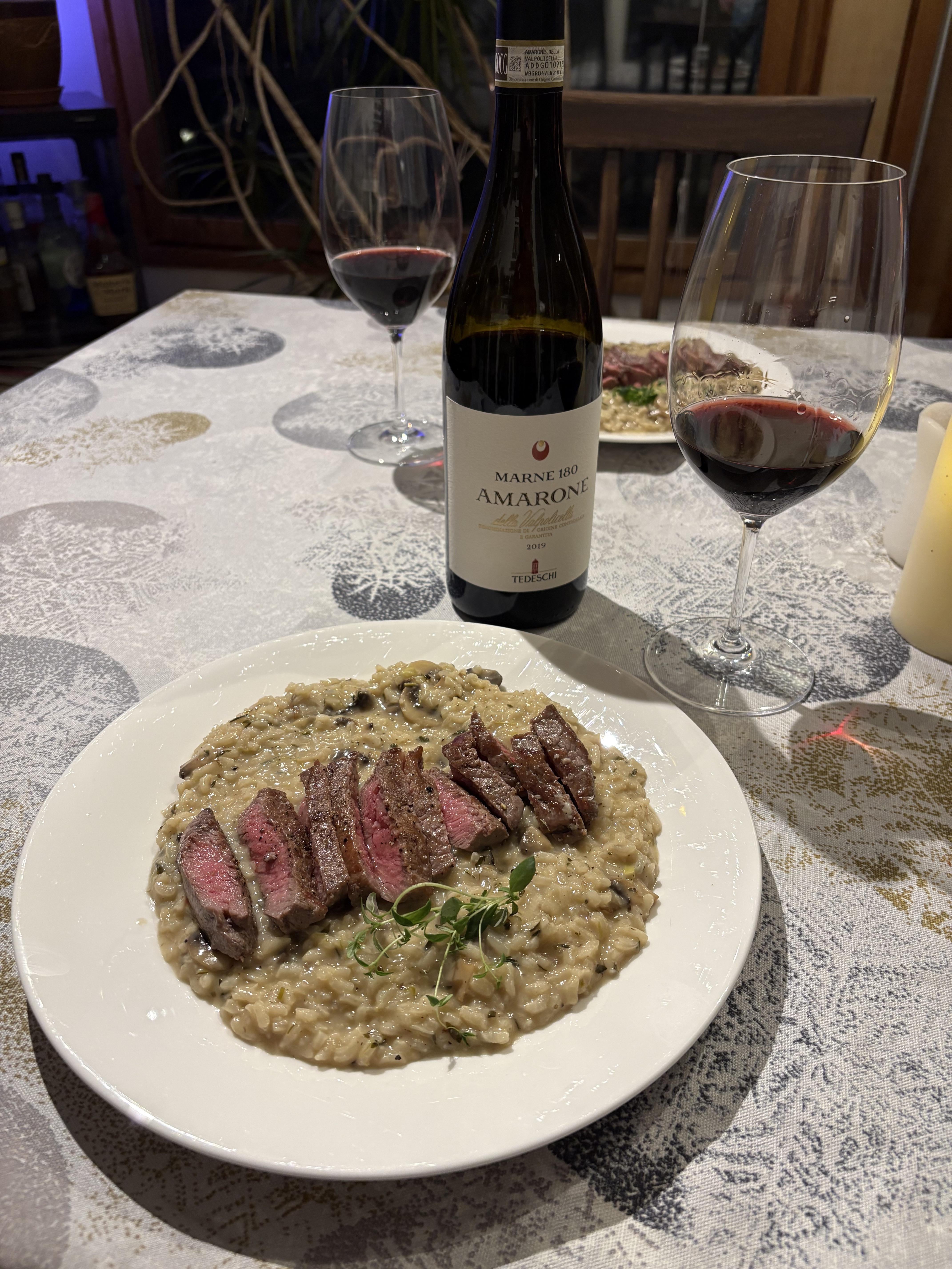 Opened a bottle for our anniversary with marbled beef and button mushroom risotto.