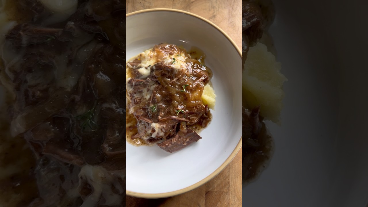 Add the onions to the crockpot over the meat. Add beef broth, thyme, rosemary and bay leaves. Cover and cook on low for 6-8 hours. Remove the bay leaves and shred the beef. Stir in the cornstarch slurry (cornstarch and water stirred together) cover and cook on high for 5-10 more minutes. Add Gruyere cheese if desired and allow to melt. Serve over mashed potatoes. Enjoy!!