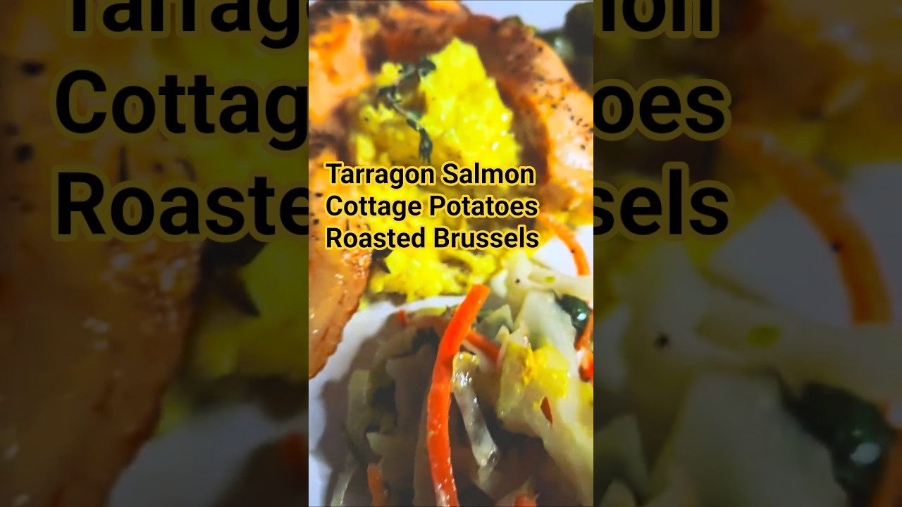 Homemade gourmet Tarragon baked Salmon with Cottage cheese potatoes and roasted Brussels sprouts and butter
