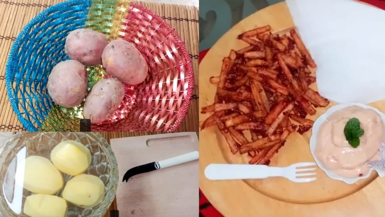 Peel and rinse the potatoes. Then cut them into sticks by cutting the potato in 4 or 5 vertical pieces, and then cutting each piece into sticks.