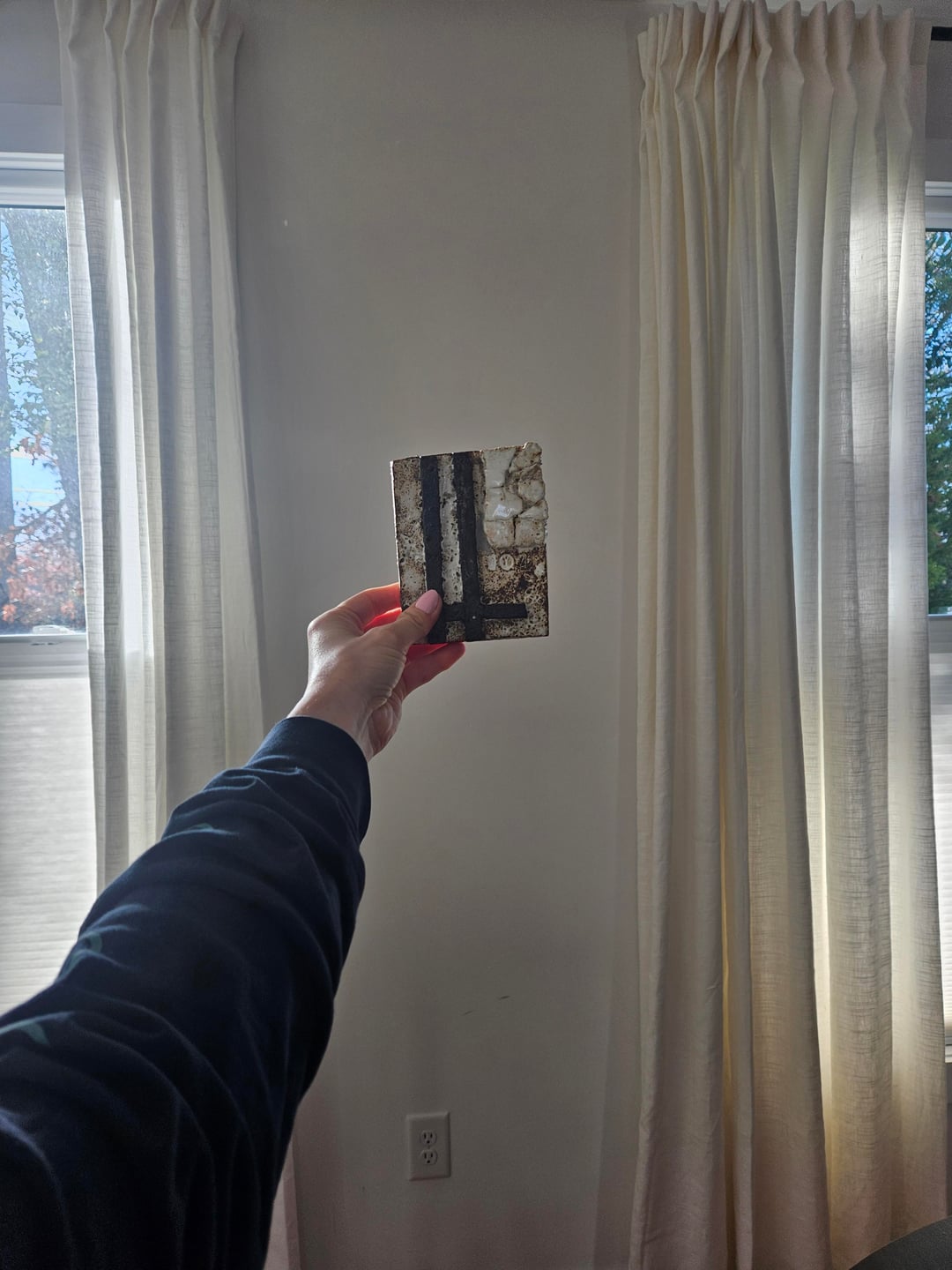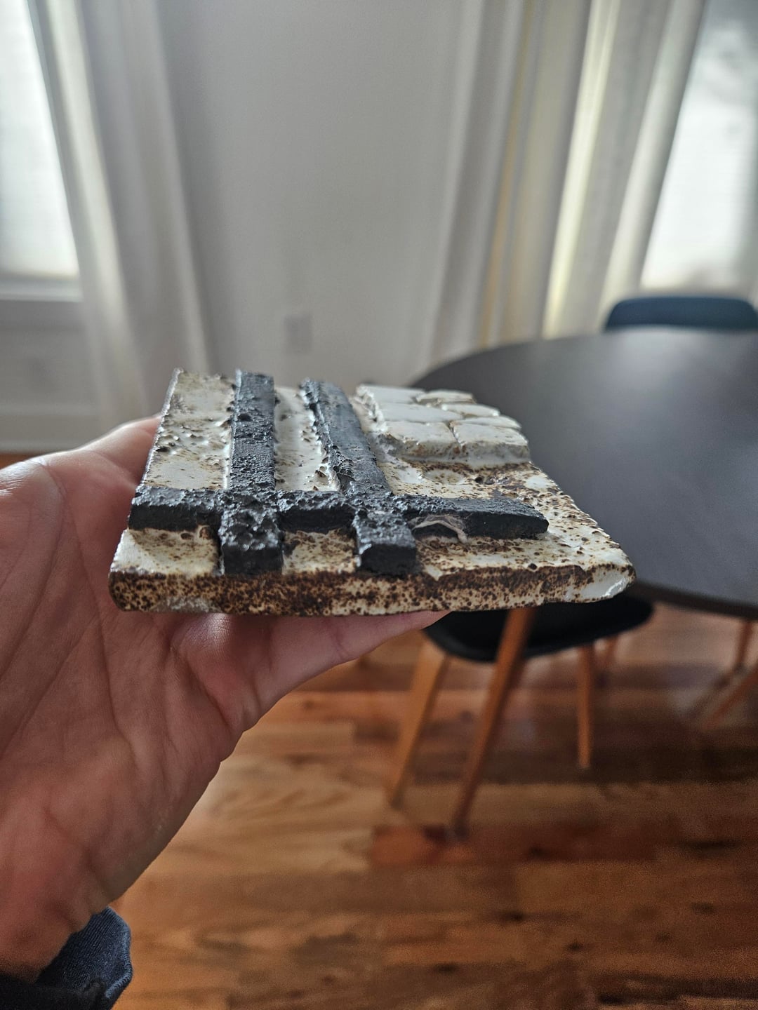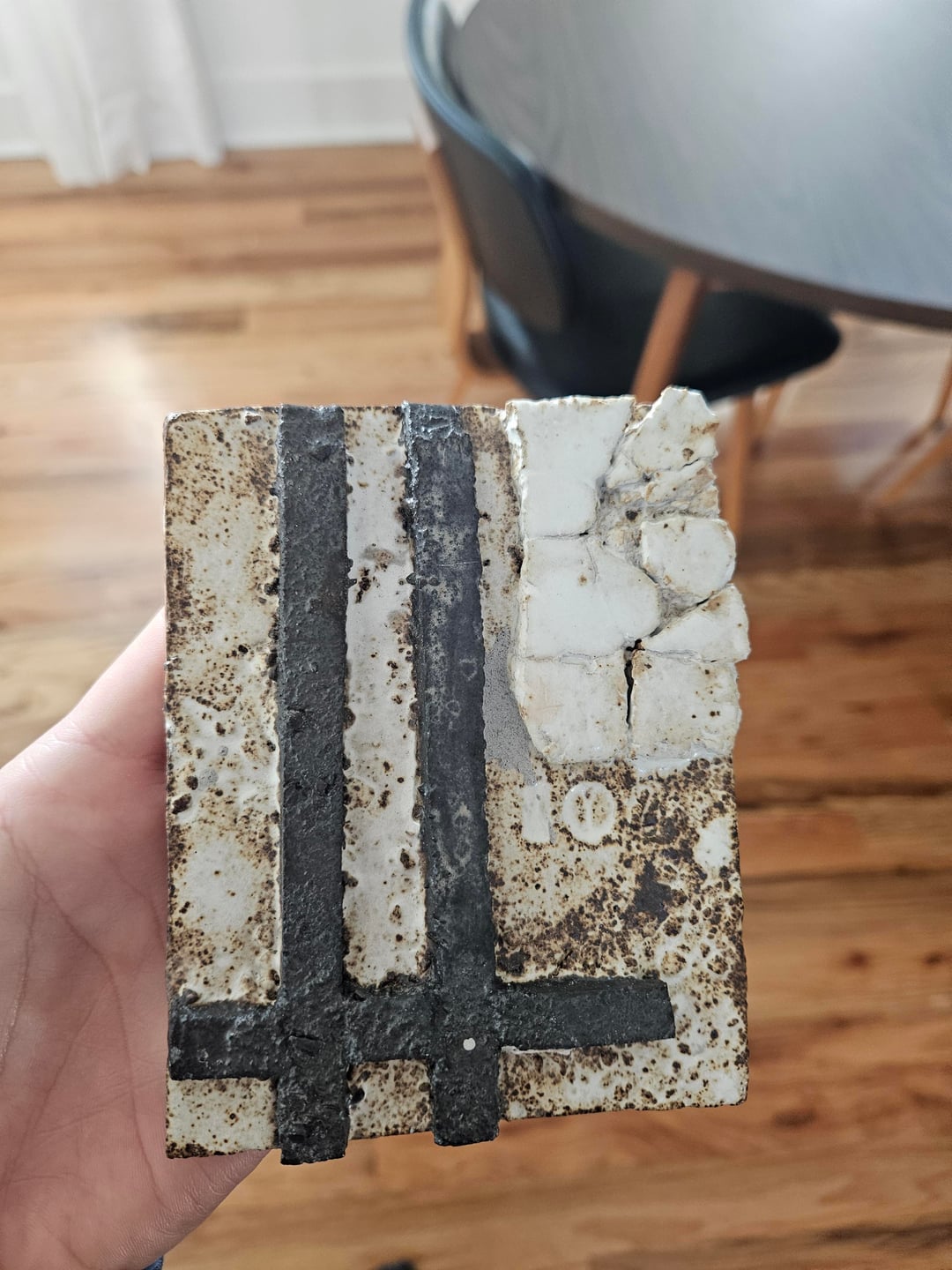 I want to hang this stone from a Europe artist. It is small so I'm wondering how to take up more space on the wall. I considered shadow box but are there other ideas too? And how do you even go about hanging stone like this or do you place on brackets that just support the bum of the art? It's heavy ish and I don't feel comfortable drilling into it or anything for mounting. Basically….how art wall plz