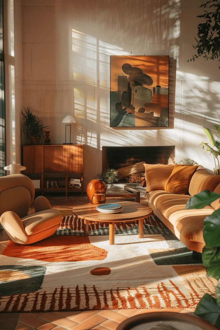 My partner and I were browsing Pinterest and came upon this image that is clearly AI generated but the rug has the look and feel we're going for. Any reverse image search doesn't really capture the aesthetic, and I can't describe it well enough to find anything close. I've tried mid-century abstract, cubist, vintage, etc. What would you call this style and do you have recommendations?