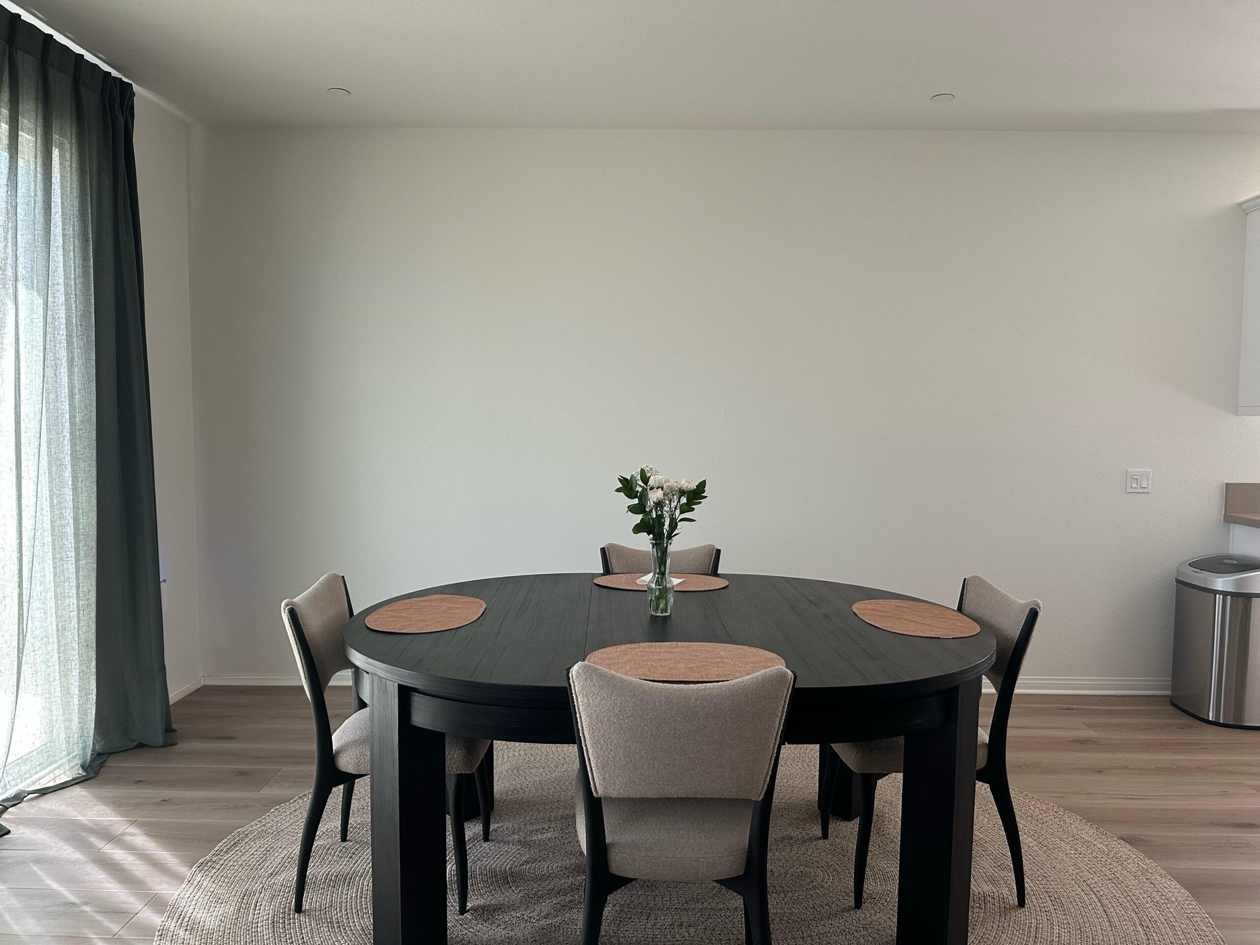 We just finished getting all the pieces for this dining room with the rug arriving yesterday so it finally feels like time to move on to decor. One thing to note is I took the photo from the back of our couch, this space is open kitchen living dining, so a lot of the color scheme flows together.