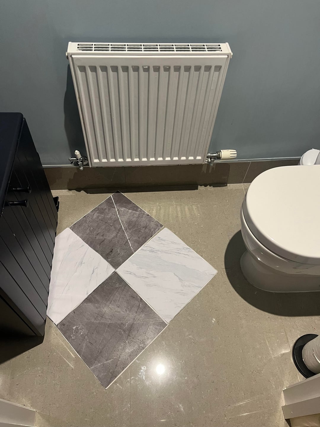 The tiles in the bathroom currently cover the floor and then partially go up the wall in certain spots – do I carry the peel & stick up the wall too and essentially just cover all the tile? I’m thinking of doing a gray & white diamond pattern if that matters.